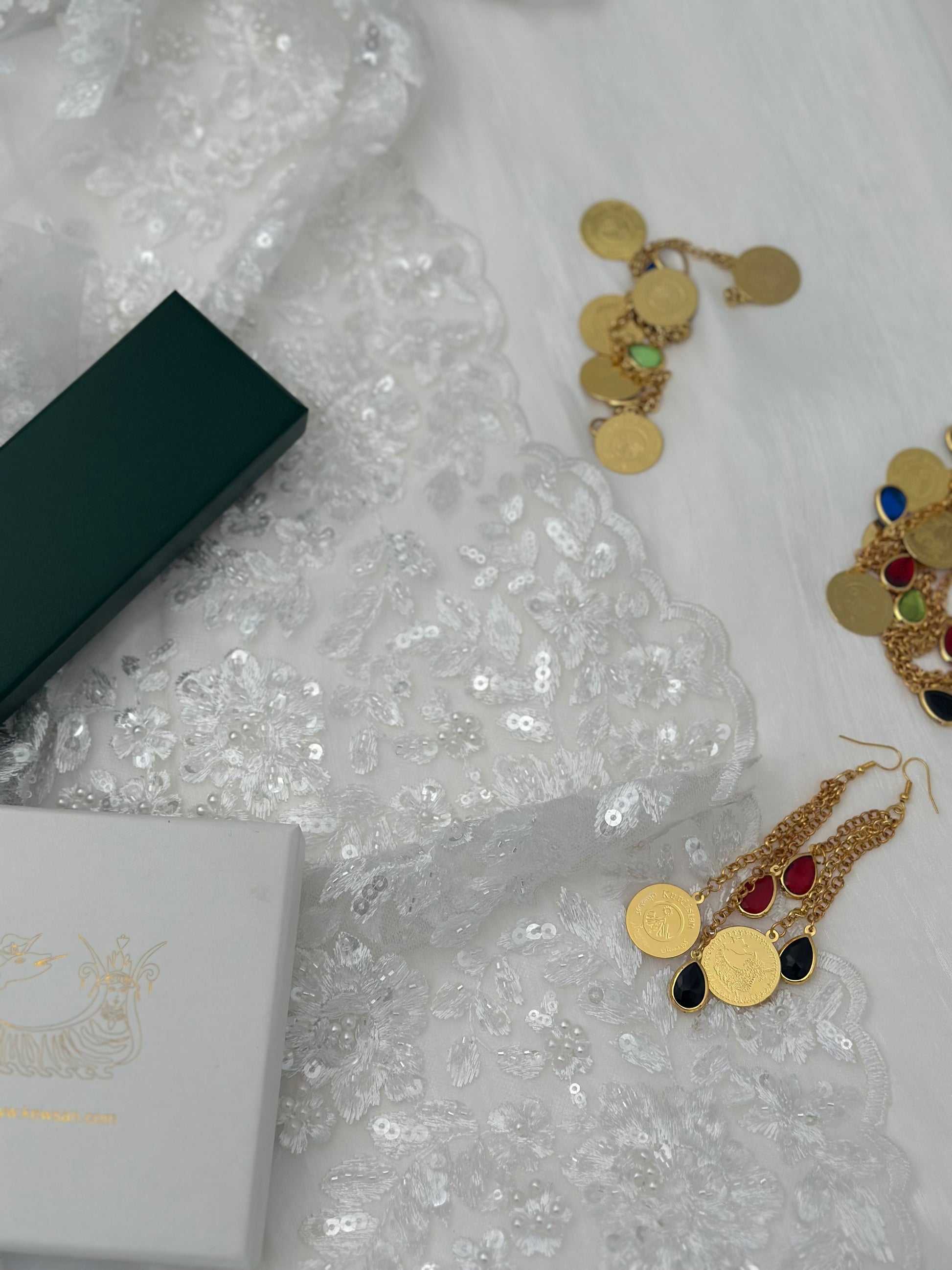 ✨ Kawa – Ein Oberkleid im Kaftan-Stil aus feinem Netzstoff, das auf beiden Vorderseiten mit funkelnden Kristallen und Pailletten bestickt ist und so für einen strahlenden und königlichen Braut-Look sorgt.