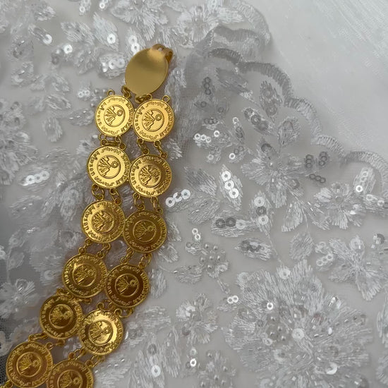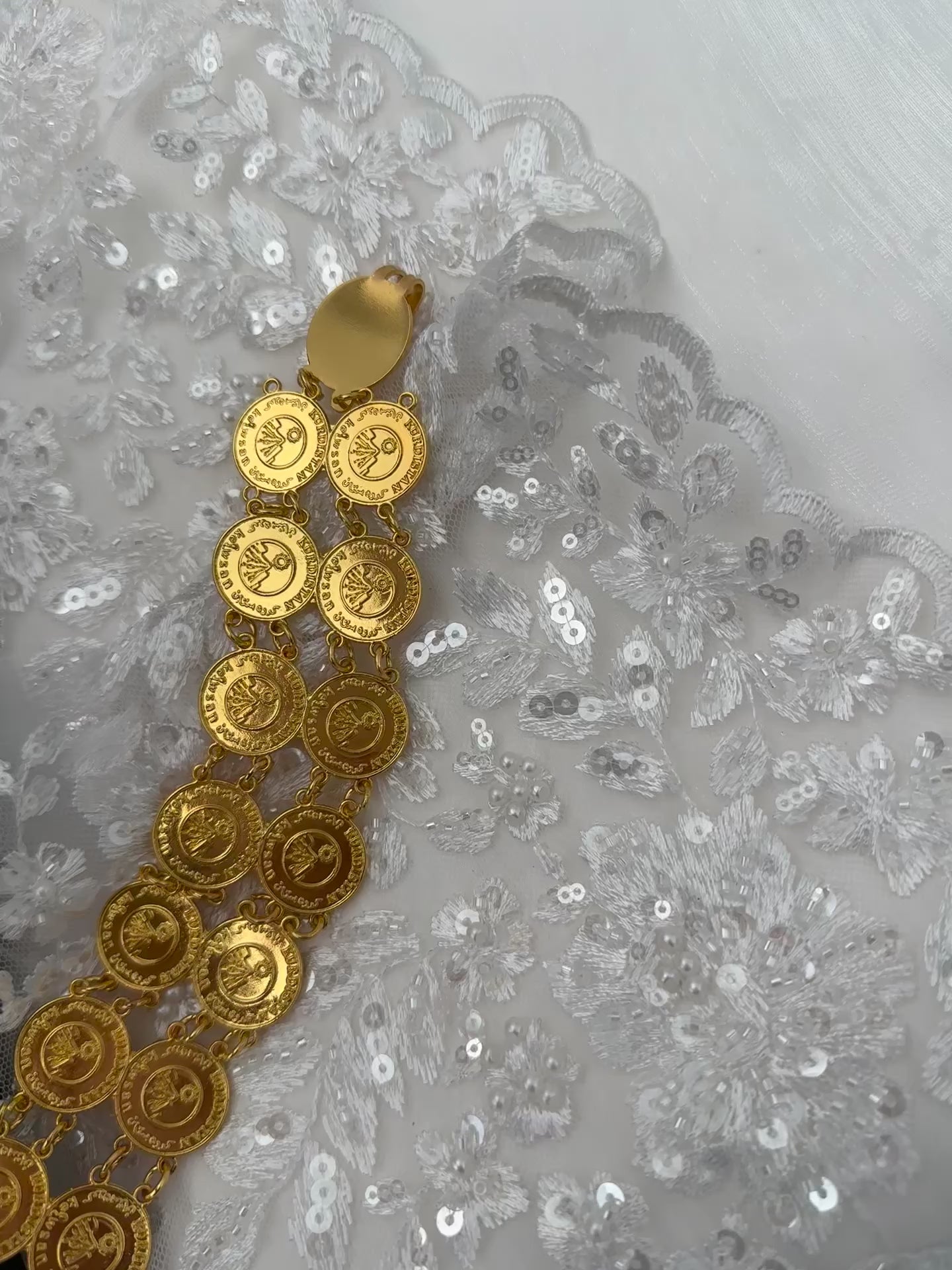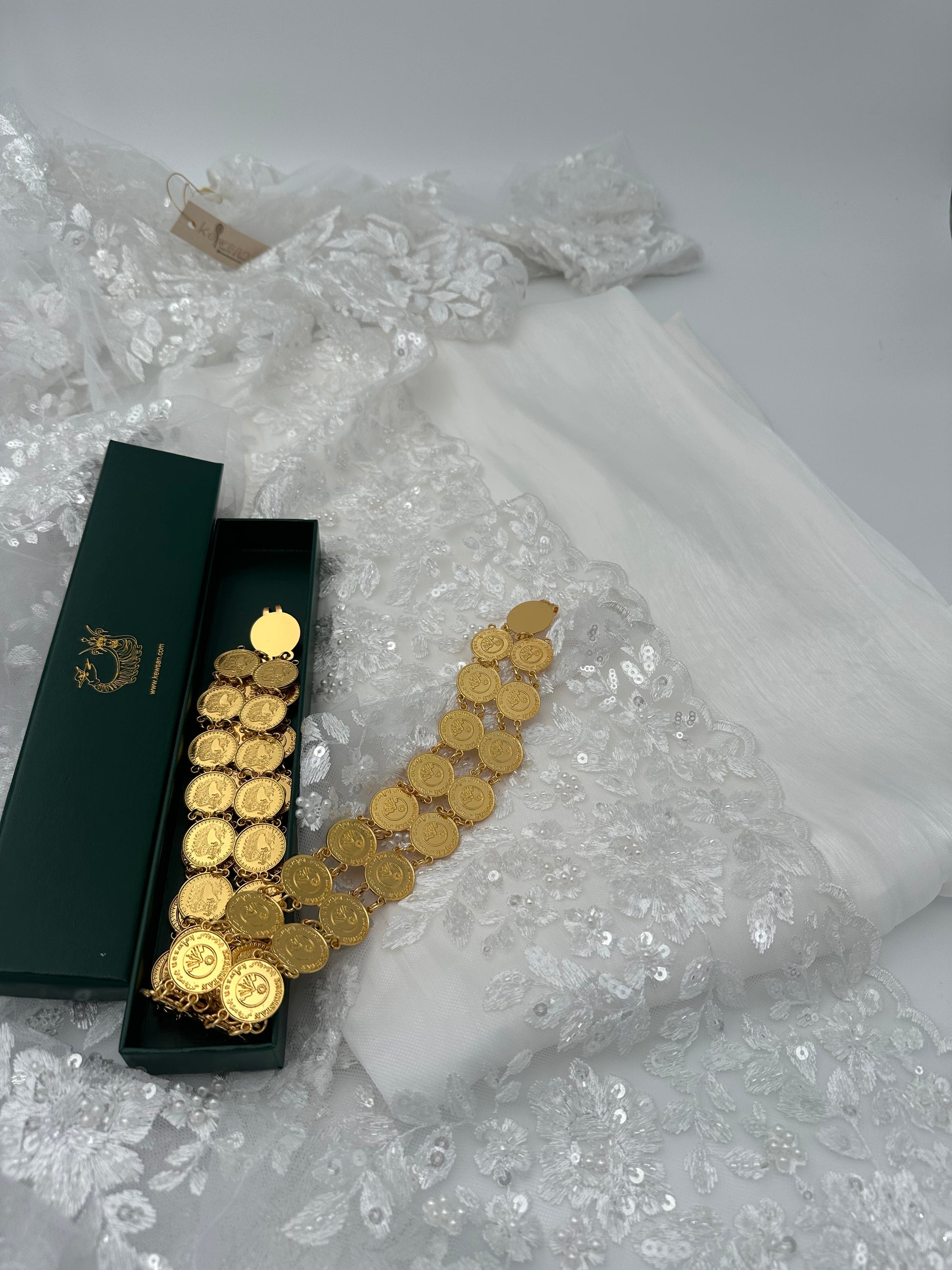 Kombinieren Sie dieses Kleid mit silbernen oder goldenen Accessoires aus unserer Shamaran-Kollektion für einen unvergesslichen Brautlook. Gürtel, Ohrringe und Halsketten, die das kurdische Erbe widerspiegeln, runden Ihr Outfit stilvoll und bedeutungsvoll ab.