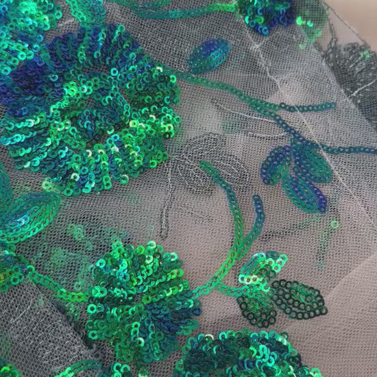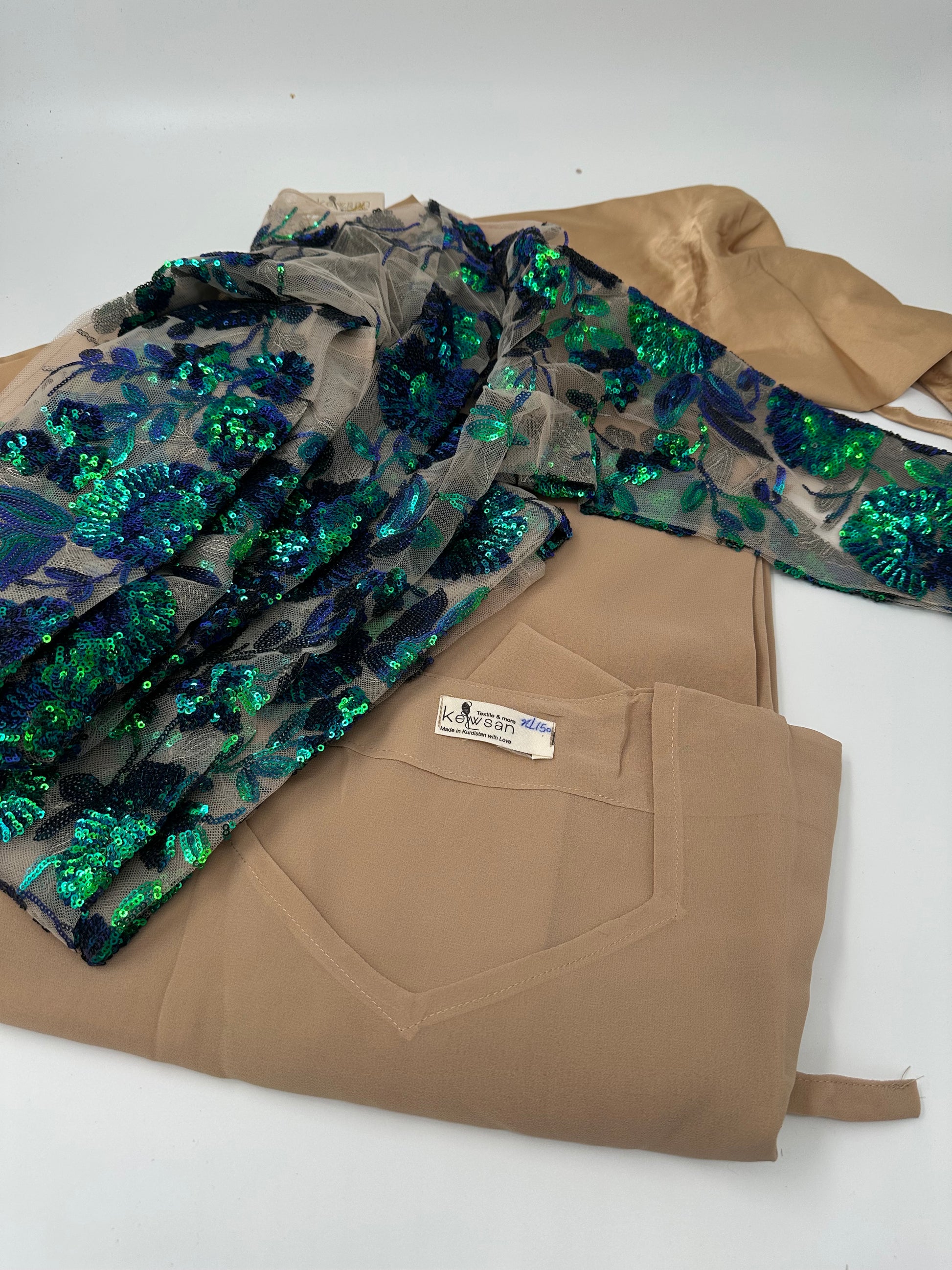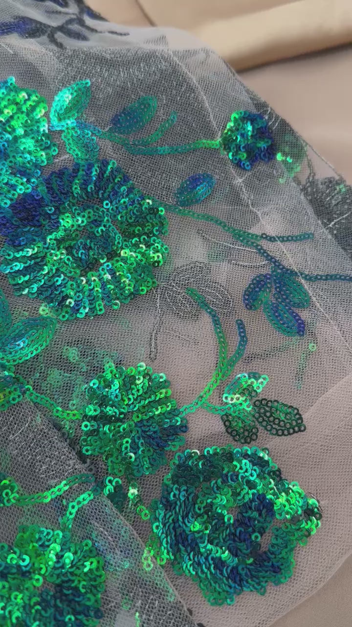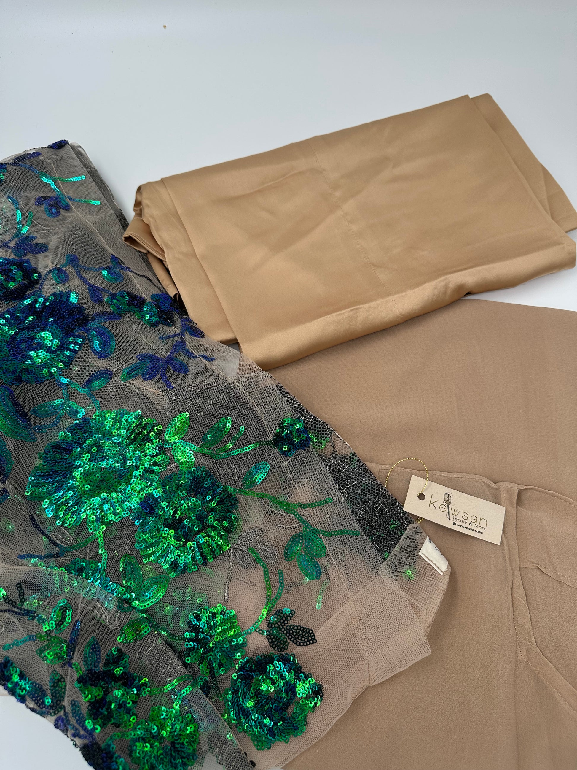 Elegantes Design : Inspiriert von der Schönheit der Natur präsentiert das Dildar-Kleid eine atemberaubende Mischung aus schimmernden Grün- und Blautönen, die an einen im Sonnenlicht glitzernden Entenkopf erinnern. Gefertigt aus einem Netzstoff, der mit dichter Paillettenstickerei verziert ist , strahlt dieses Kleid Raffinesse und Anmut aus.