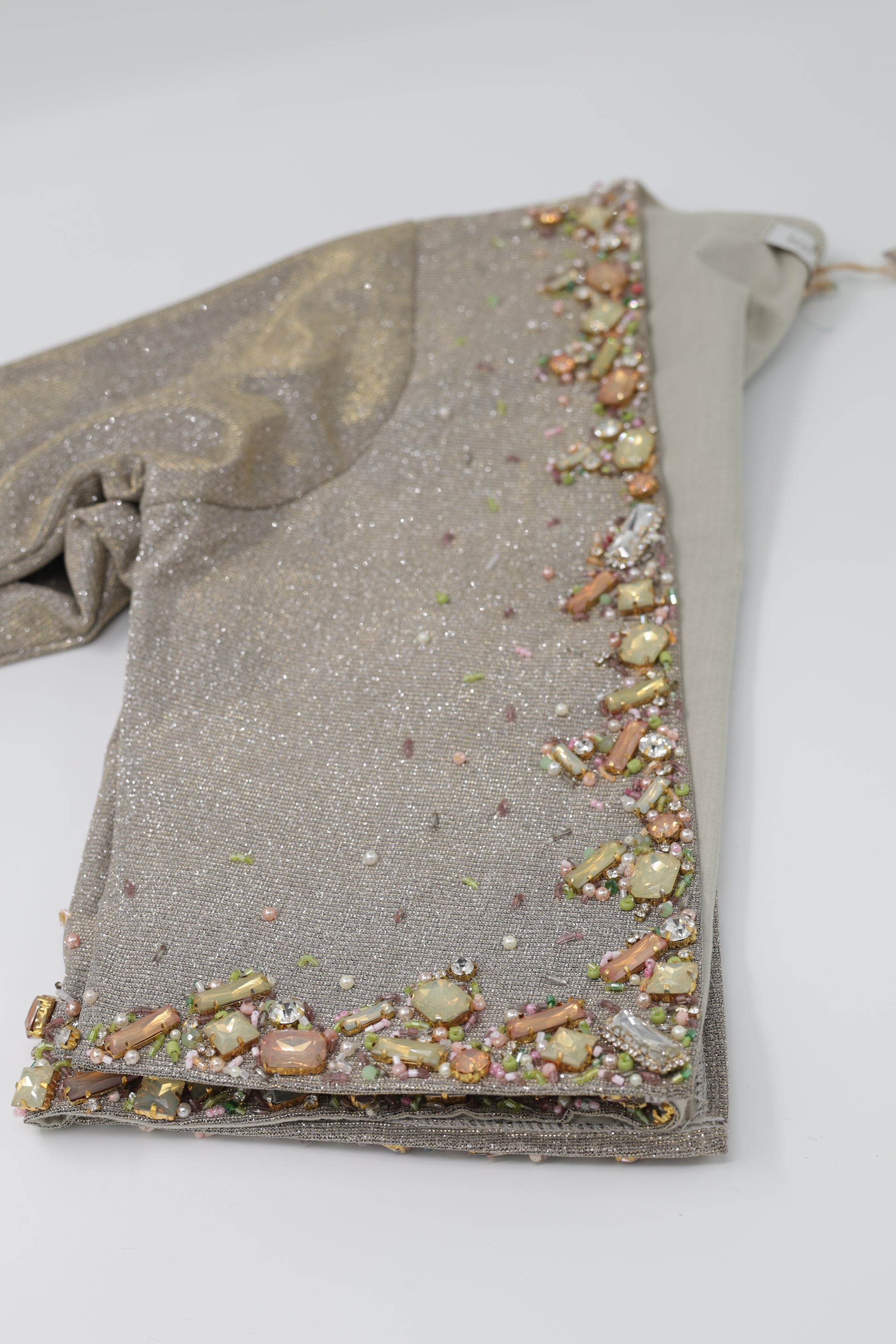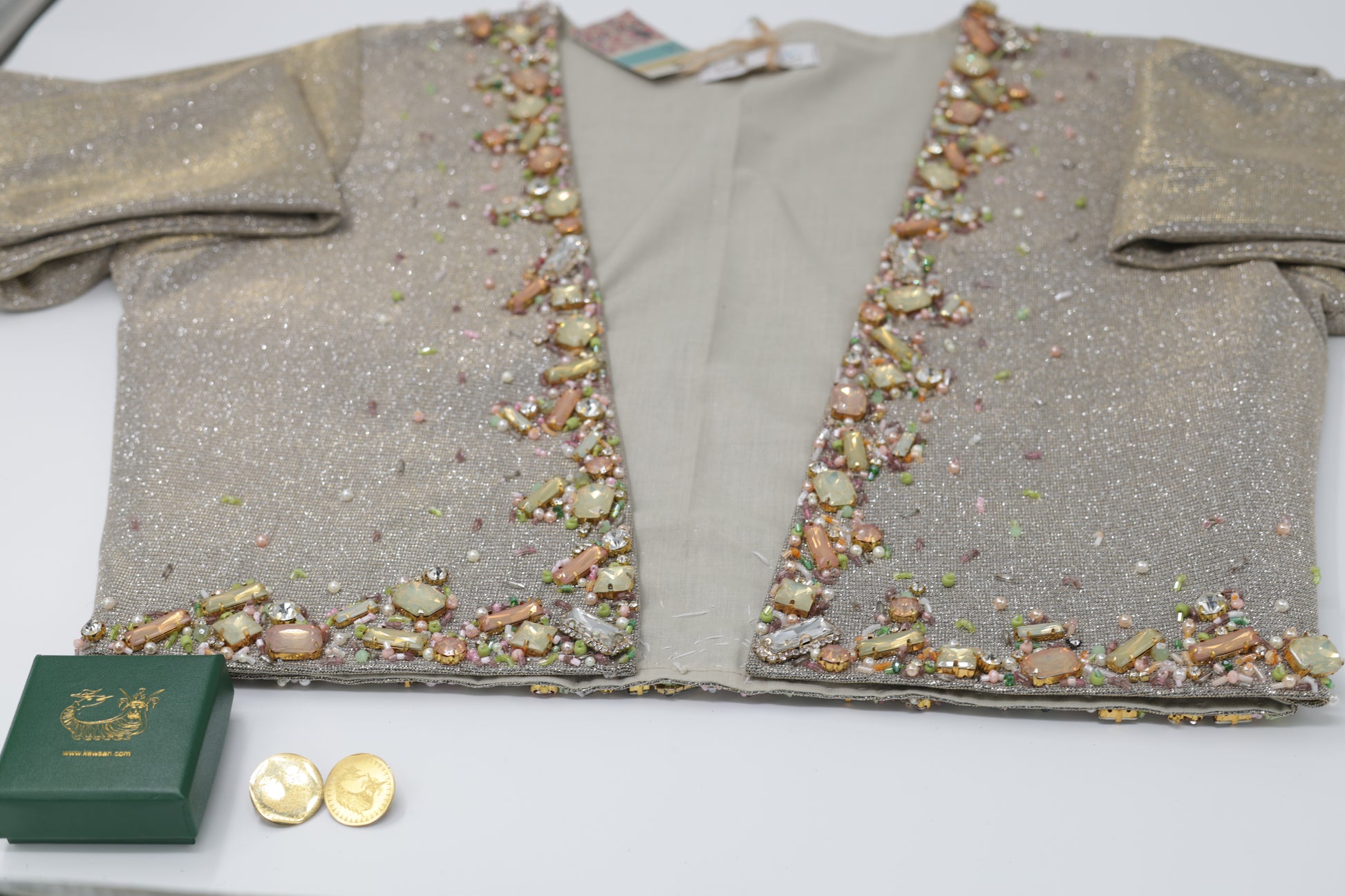 The vest is decorated with hand-placed Swarovski stones, beads, and crystals that add a soft shine and luxurious look. Every detail is made with care, showing the beauty of Kurdish handmade craftsmanship. Because it is handmade, each vest is unique and special.