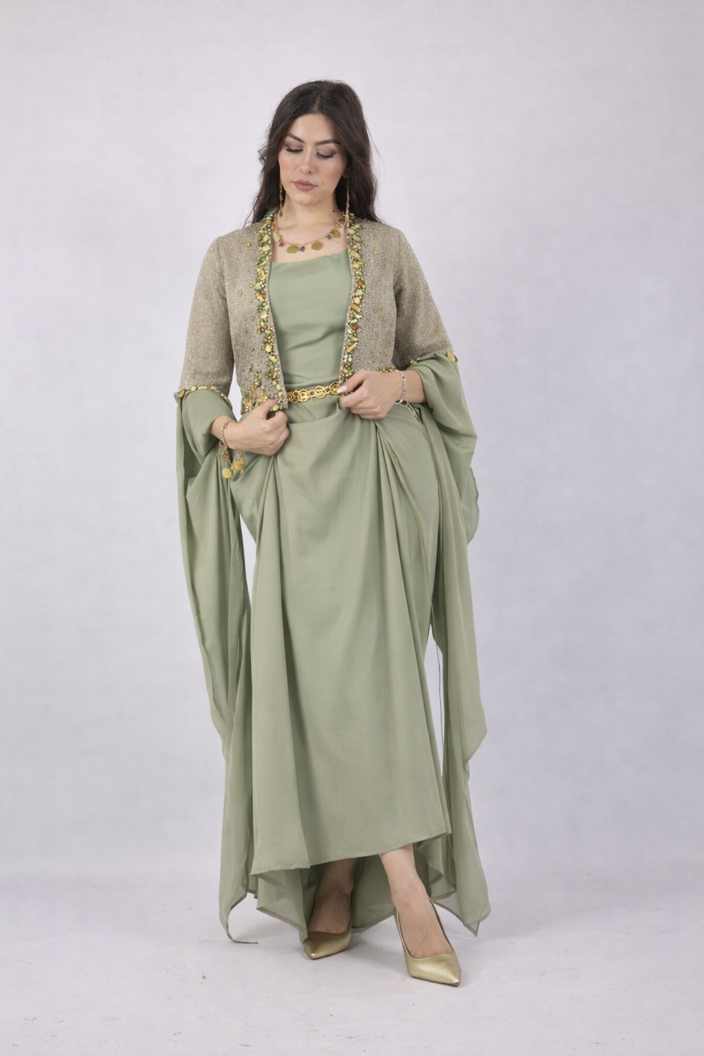 This beautiful handmade Kurdish vest is carefully crafted by hand and inspired by traditional Kurdish culture. It features elegant sleeves and an open front design, making it perfect to wear over a Kurdish dress or a modern outfit.