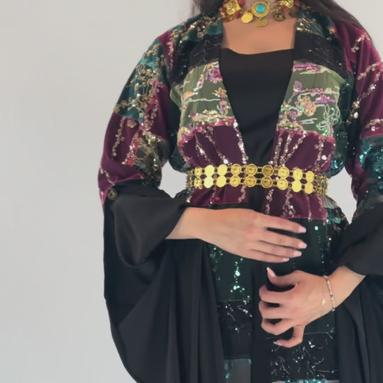 Kurdish dress, sustainable Kurdish fashion, handmade in Kurdistan, eco-friendly Kurdish set, Shamaran accessories, Kurdish kawa, traditional Kurdish outfit, Newroz dress, artisan-made caftan, Kurdish women craftsmanship, sustainable caftan.