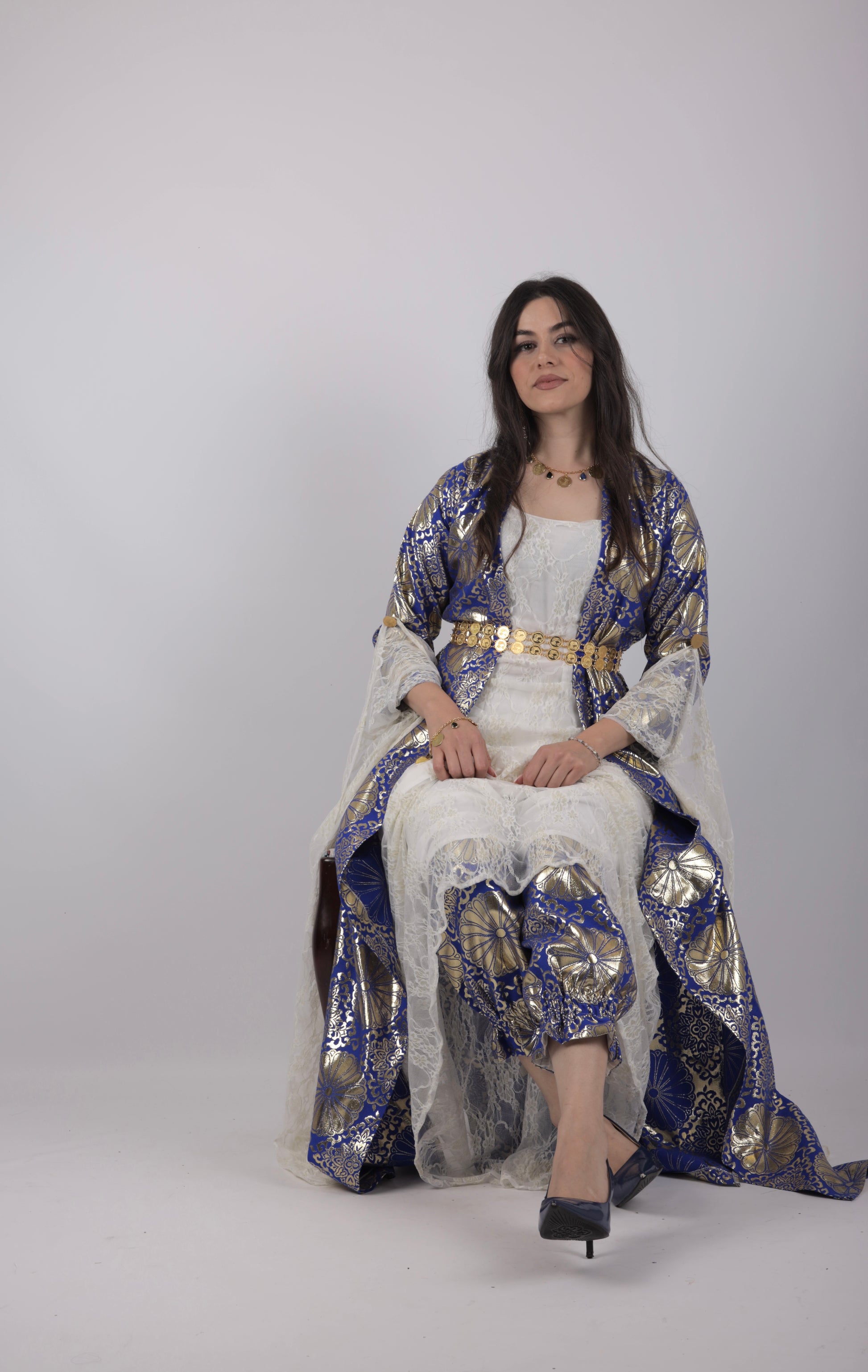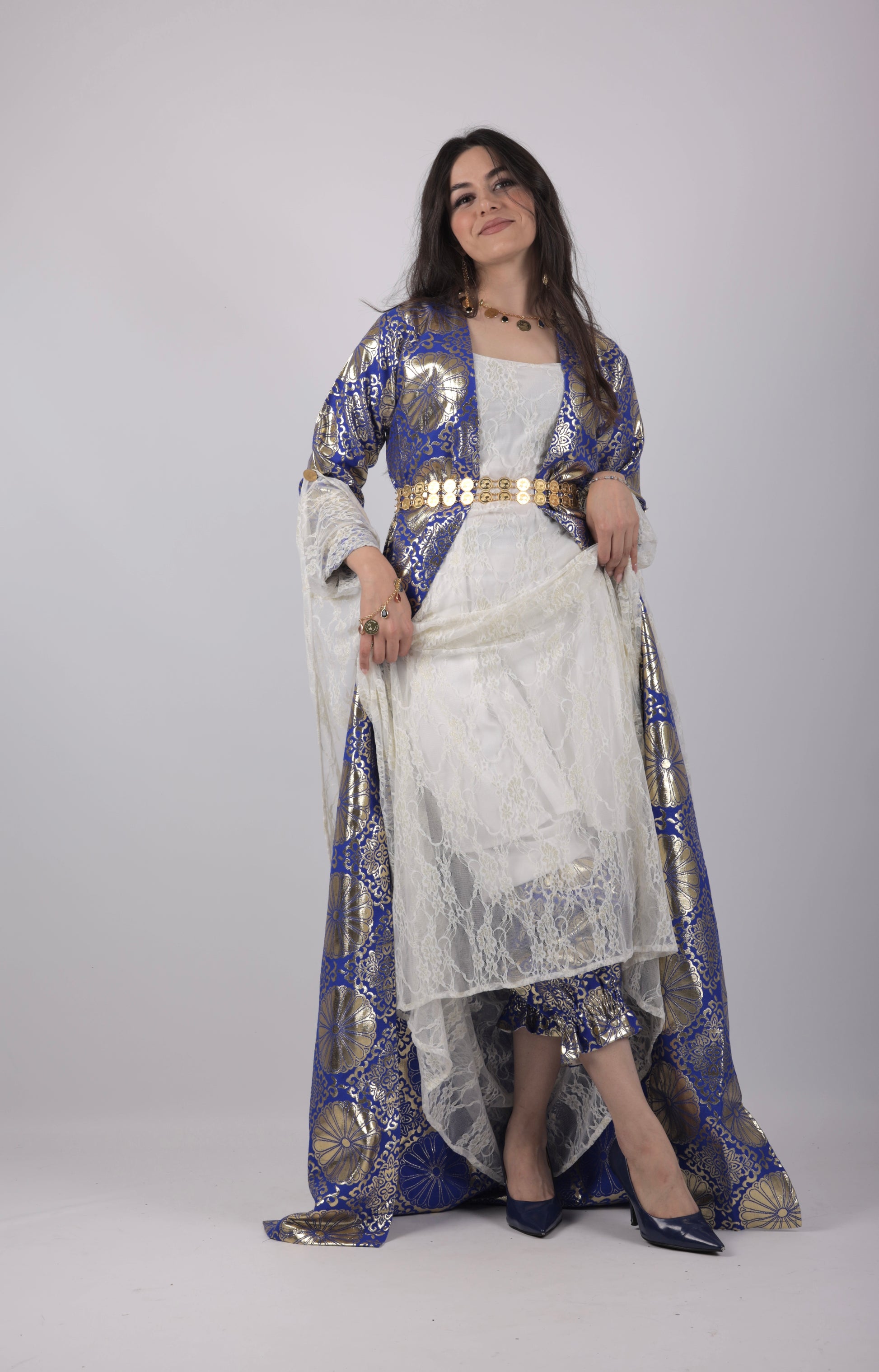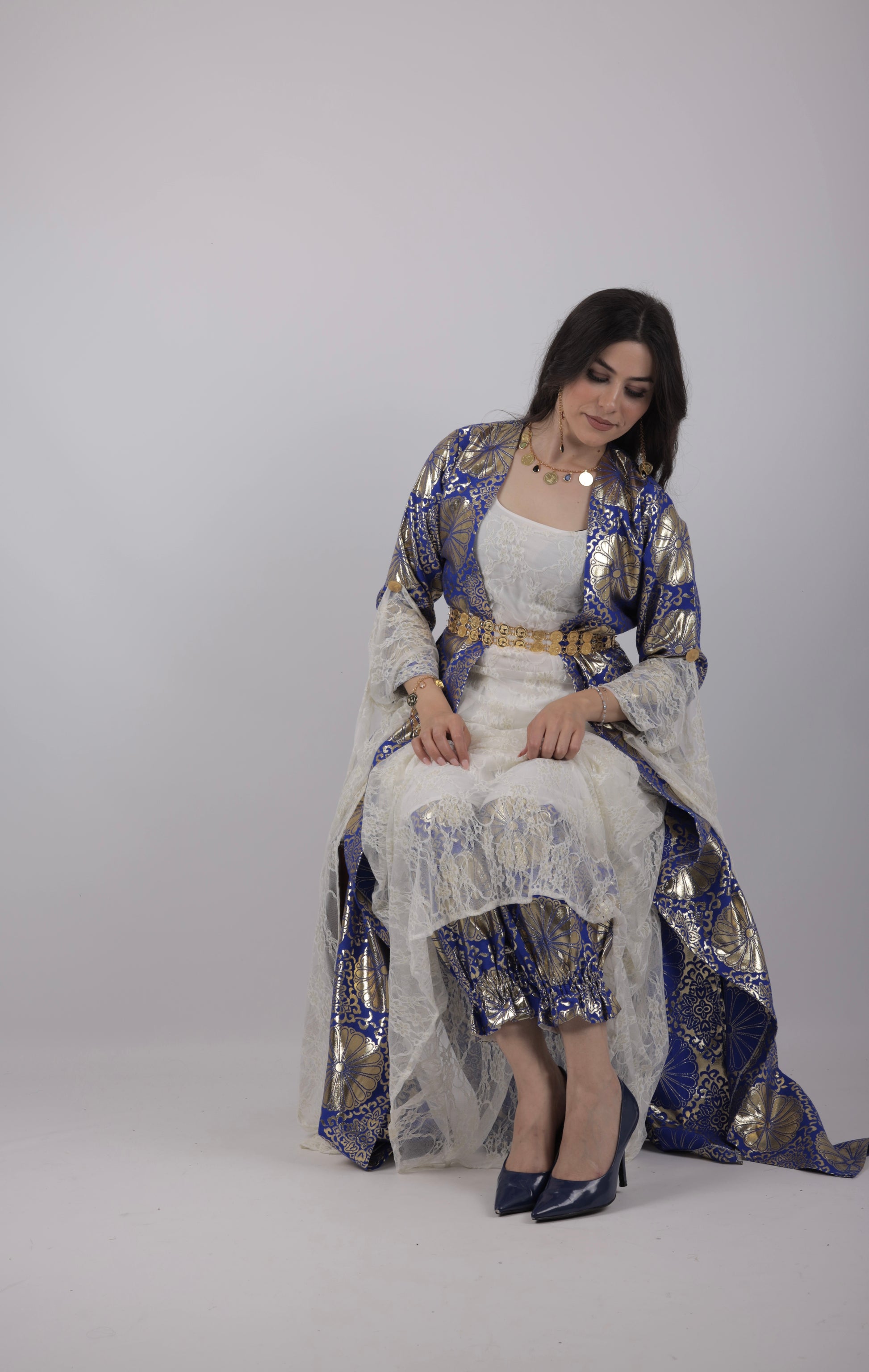 Crafted with care using premium fabrics, the Hafse Xan  set features a custom-designed golden jacquard vest, a stretch mesh Kiras dress in off-white with golden floral Darpe in classic and high quality , traditional wide Kurdish pants (Darpe), and a breathable adjustable underdress.