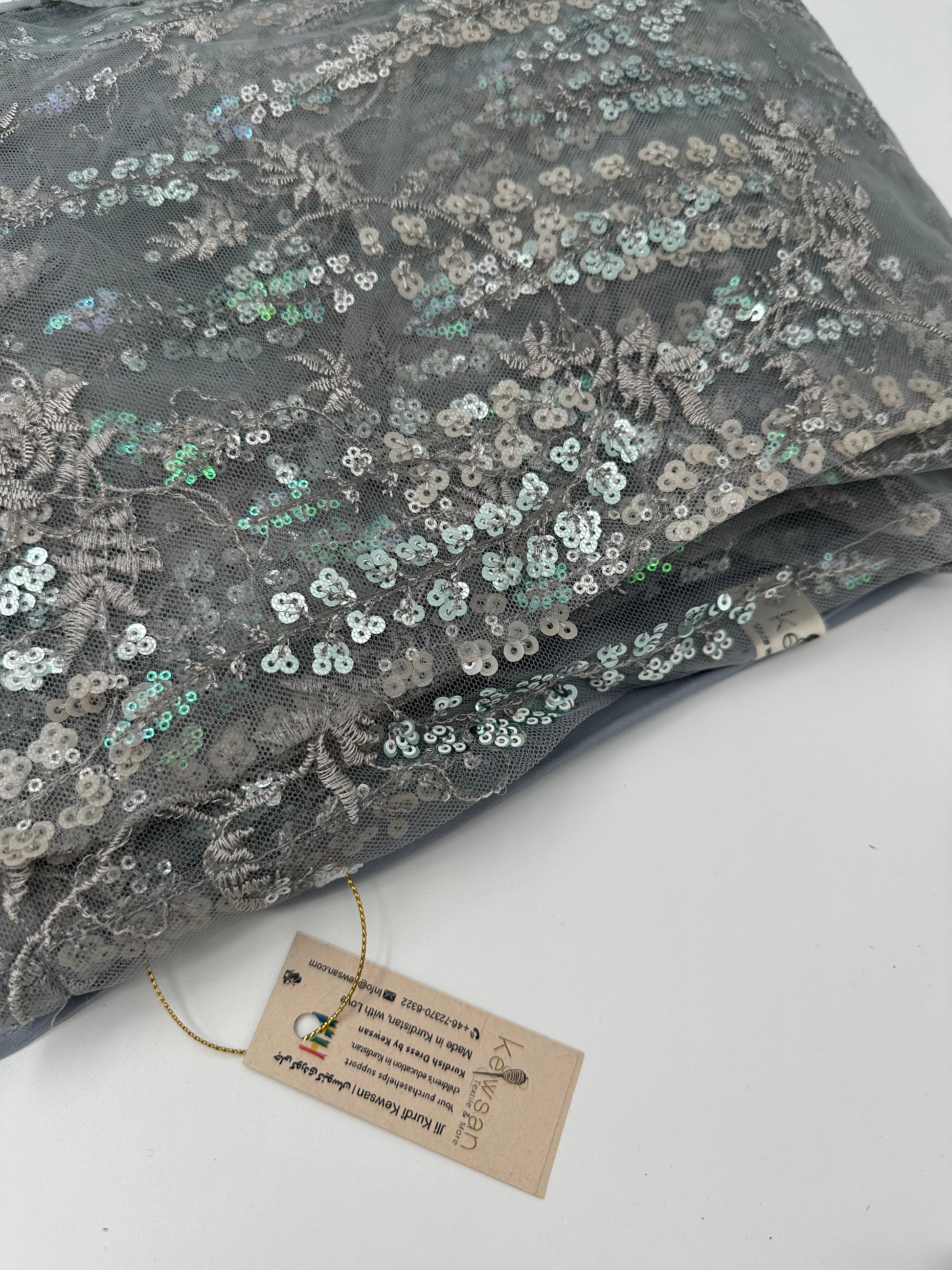 The Afsane Dress in Badini Model is designed to combine traditional Kurdish fashion with modern elegance. This beautiful blue Grey dress with silver blue grey flower embroidery is one of our most eye-catching designs, symbolizing freshness, beauty, and pride in Kurdish culture.