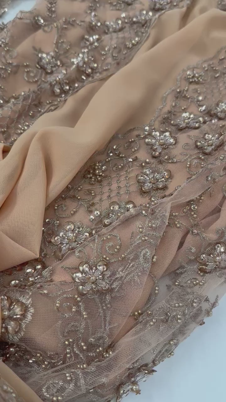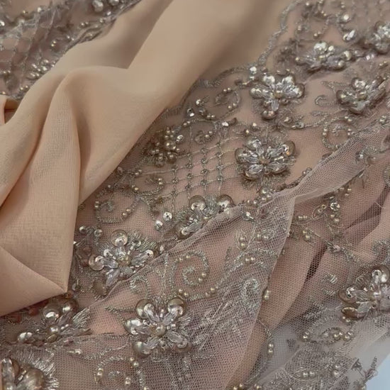 High-quality golden beige fabric with crystal, bead, and sequin embroidery