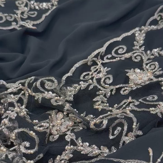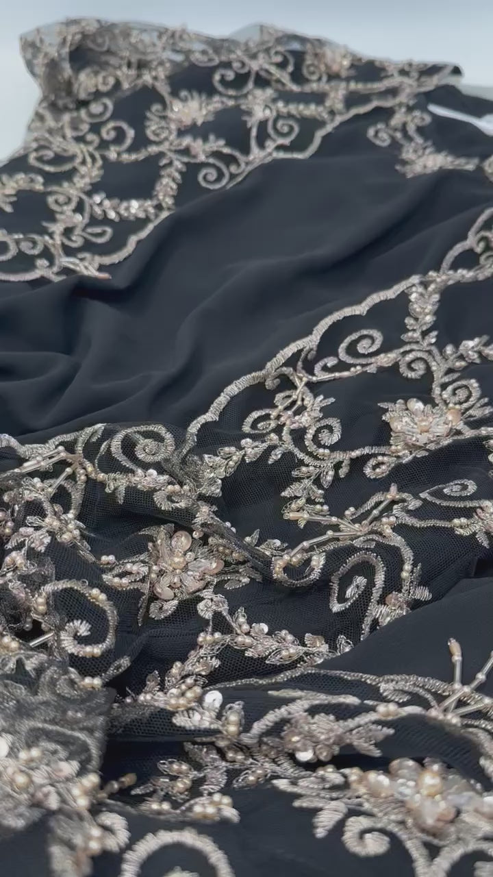 • Luxury fabric with sparkling crystals, sequins, beads, and delicate hanging pearls