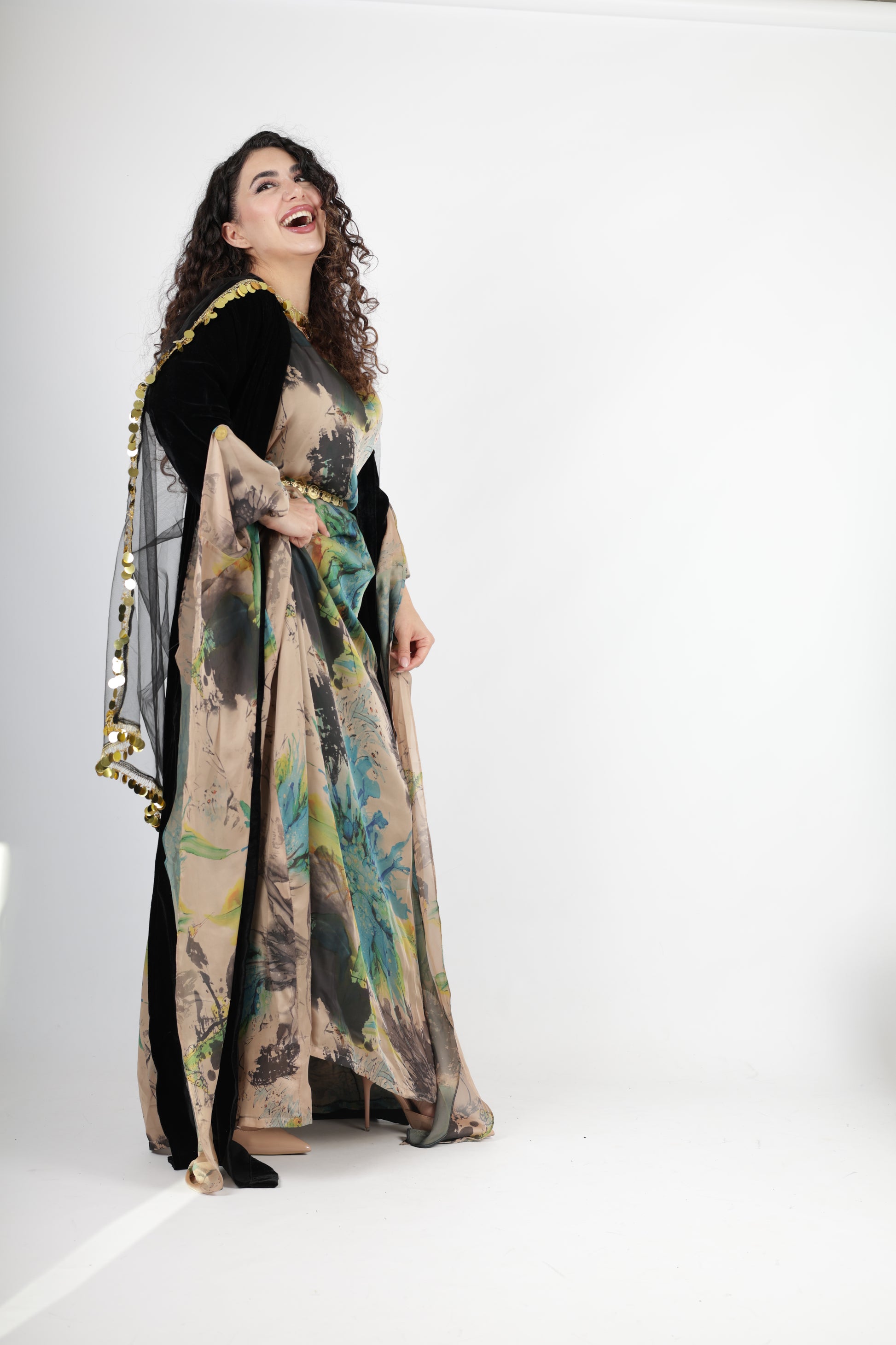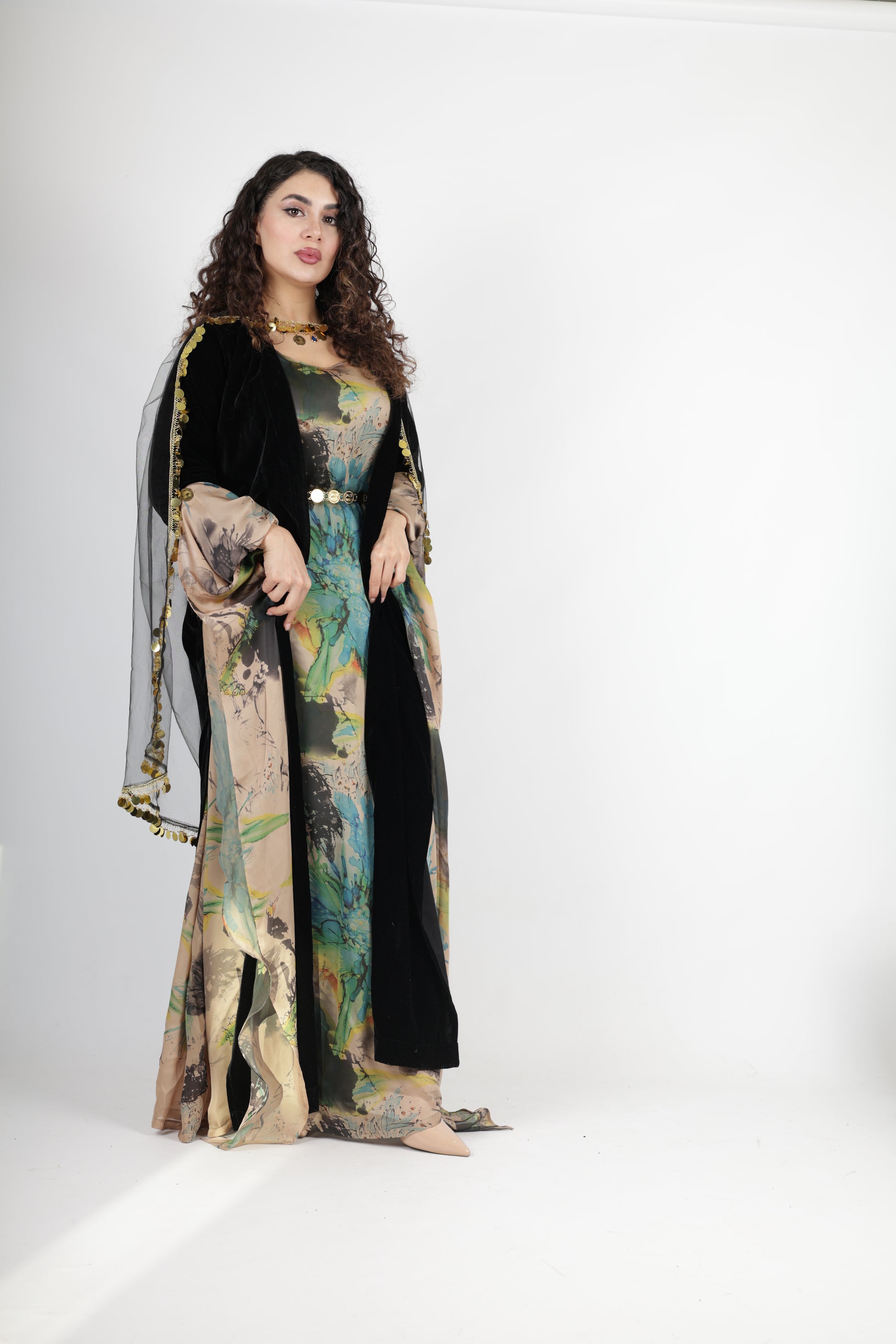 The fabric features our exclusive mango motif designed in-house by Kewsan Textile, blending authentic Kurdish artistry with a modern, sophisticated aesthetic. Rich black velvet details elevate the look, making it perfect for weddings, Newroz, and formal celebrations.