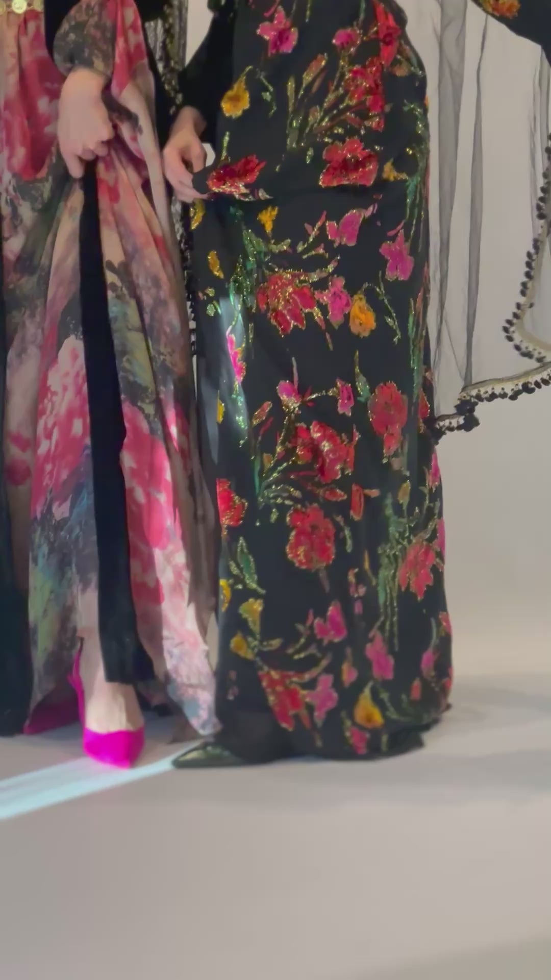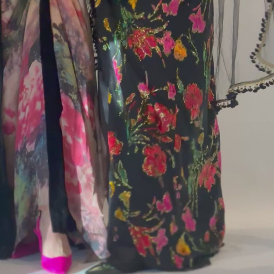 This stunning dress features a midnight black base adorned with hand-painted tulip flowers in radiant colors. Each flower is carefully drawn and painted by hand, surrounded by shimmering golden metallic jacquard woven into the fabric — creating a soft, luxurious shine that moves beautifully with every step.