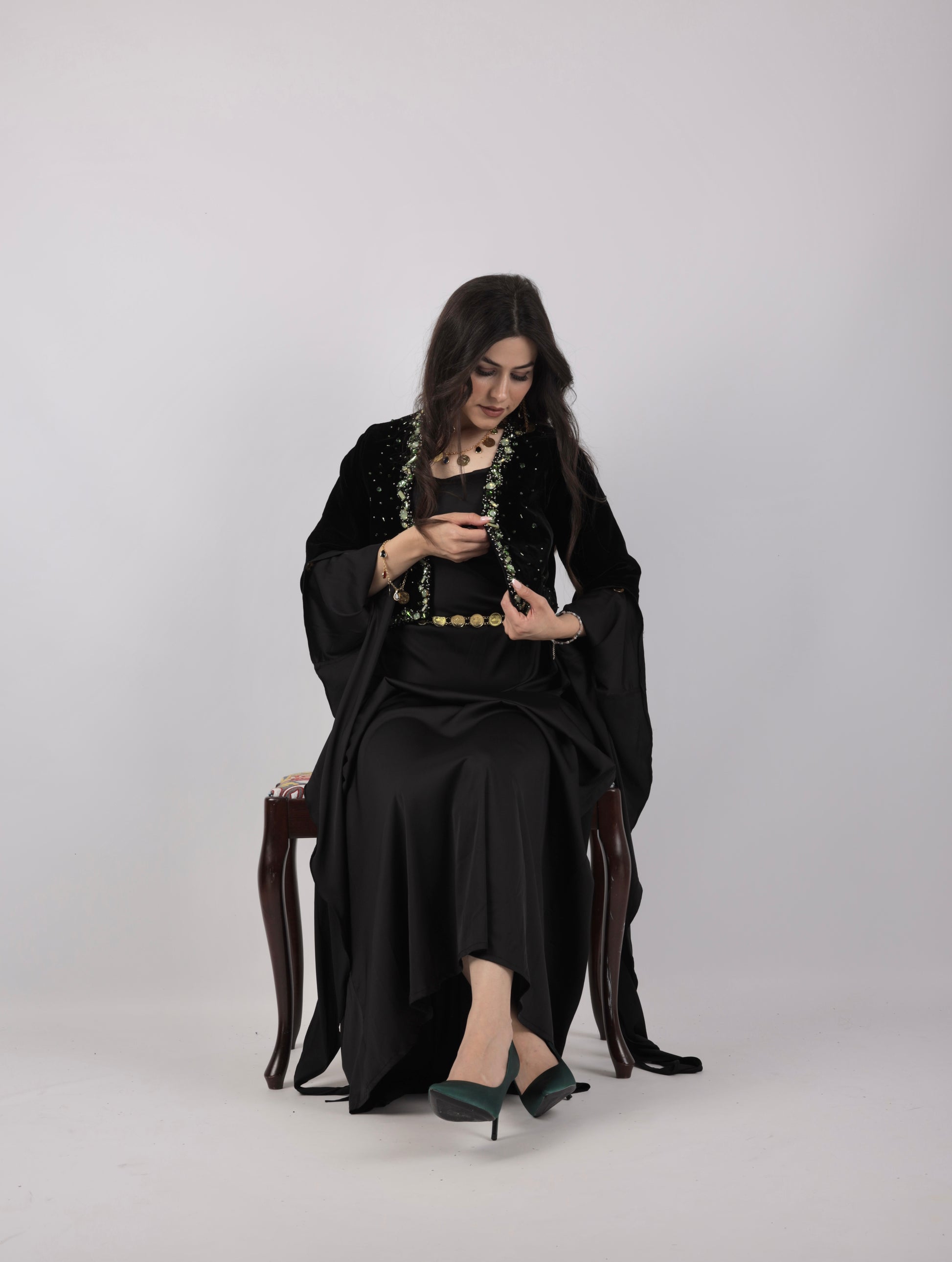 Discover the perfect blend of tradition and elegance with this Salte vest. Handmade by skilled Kurdish women artisans, this vest features high-quality tailoring and sparkling Swarovski crystals on black velvet. The rich color palette—black, dark green, and complementary tones—gives it a sophisticated look that’s perfect for special occasions or elevating everyday outfits.