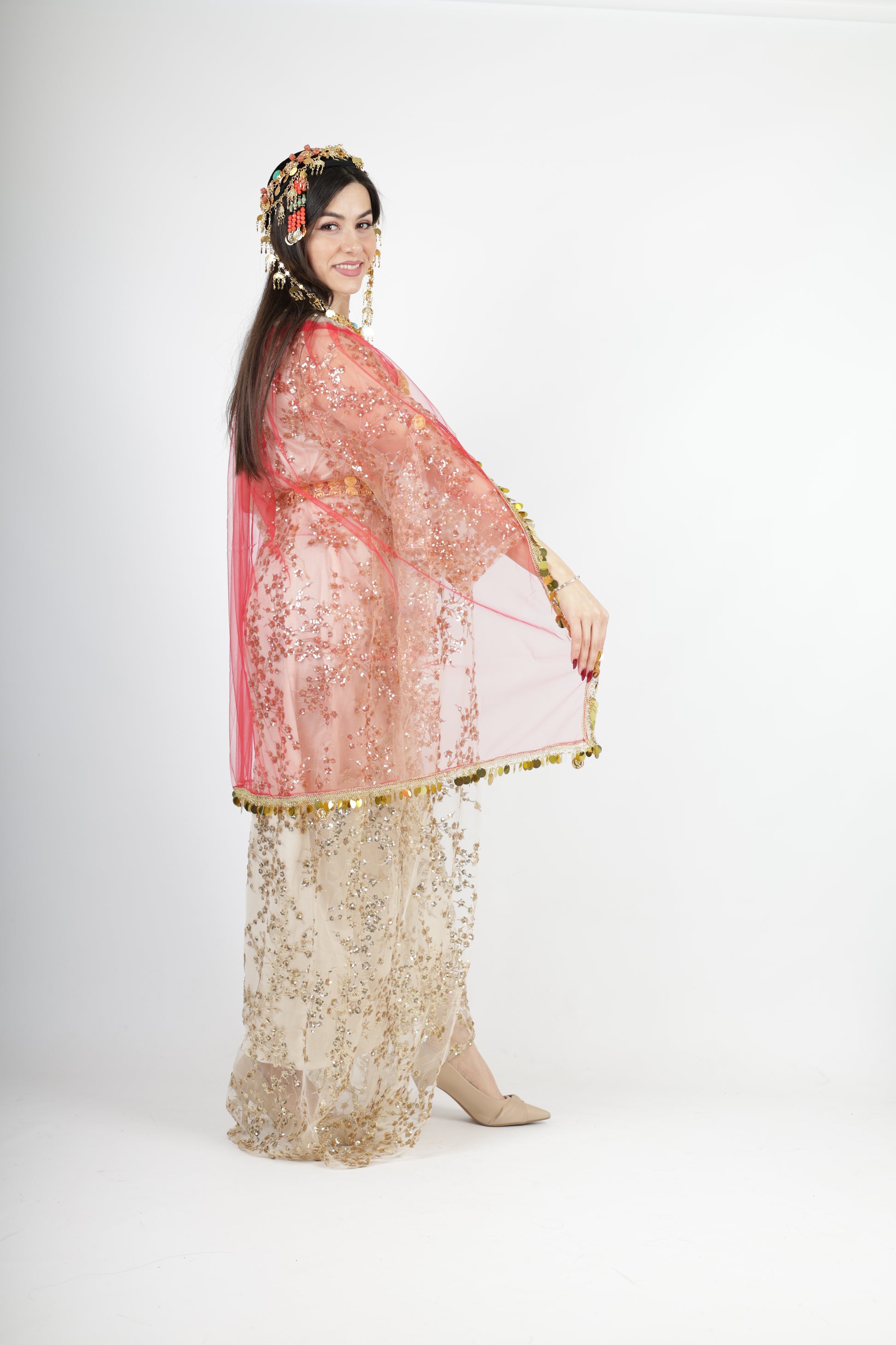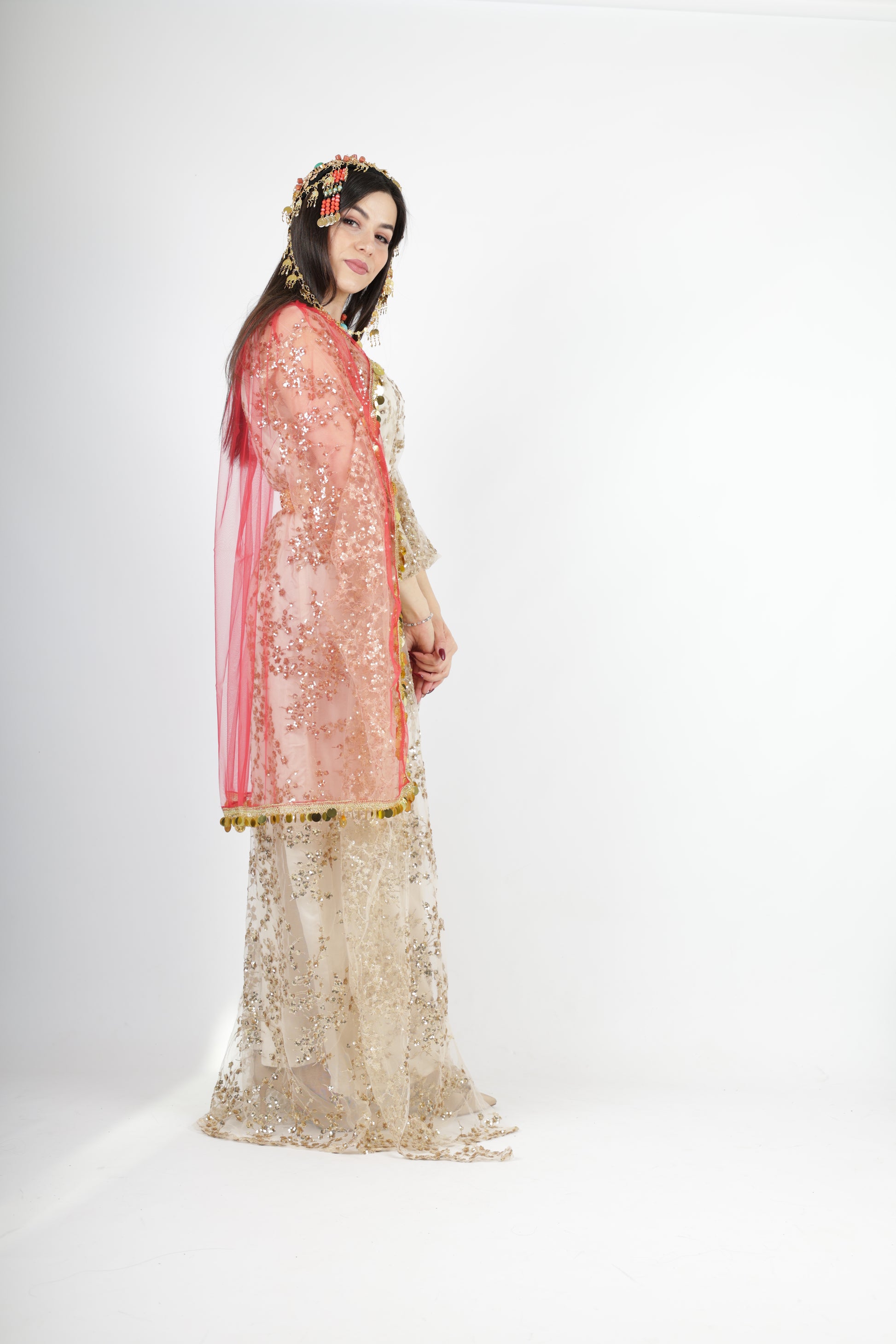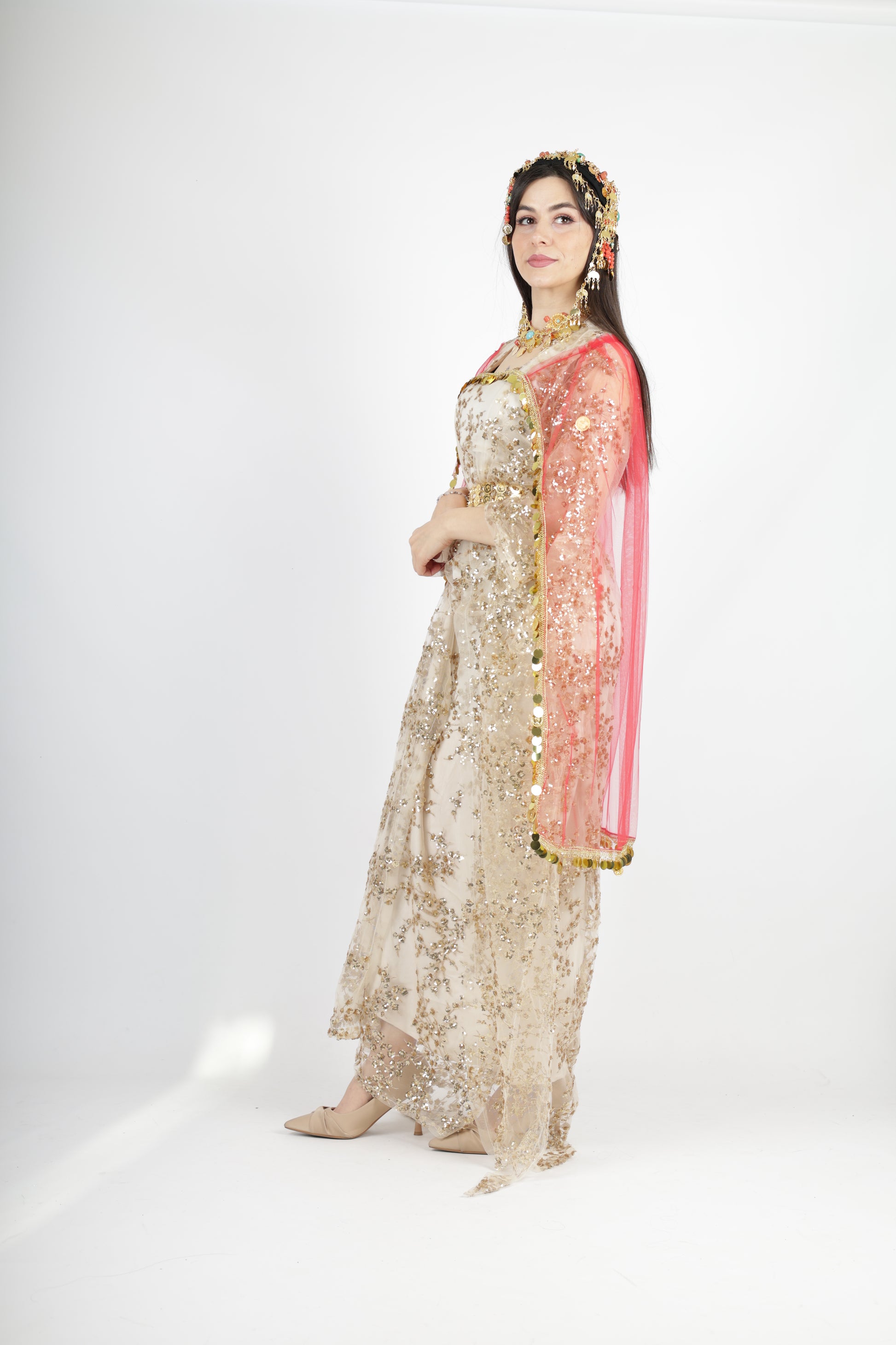 This outfit is designed to celebrate Kurdish femininity, beauty, and tradition while adding a modern, glamorous touch. Whether you’re dressing for a special event, a cultural gathering, or a celebration, this gold sequin set makes an unforgettable impression.