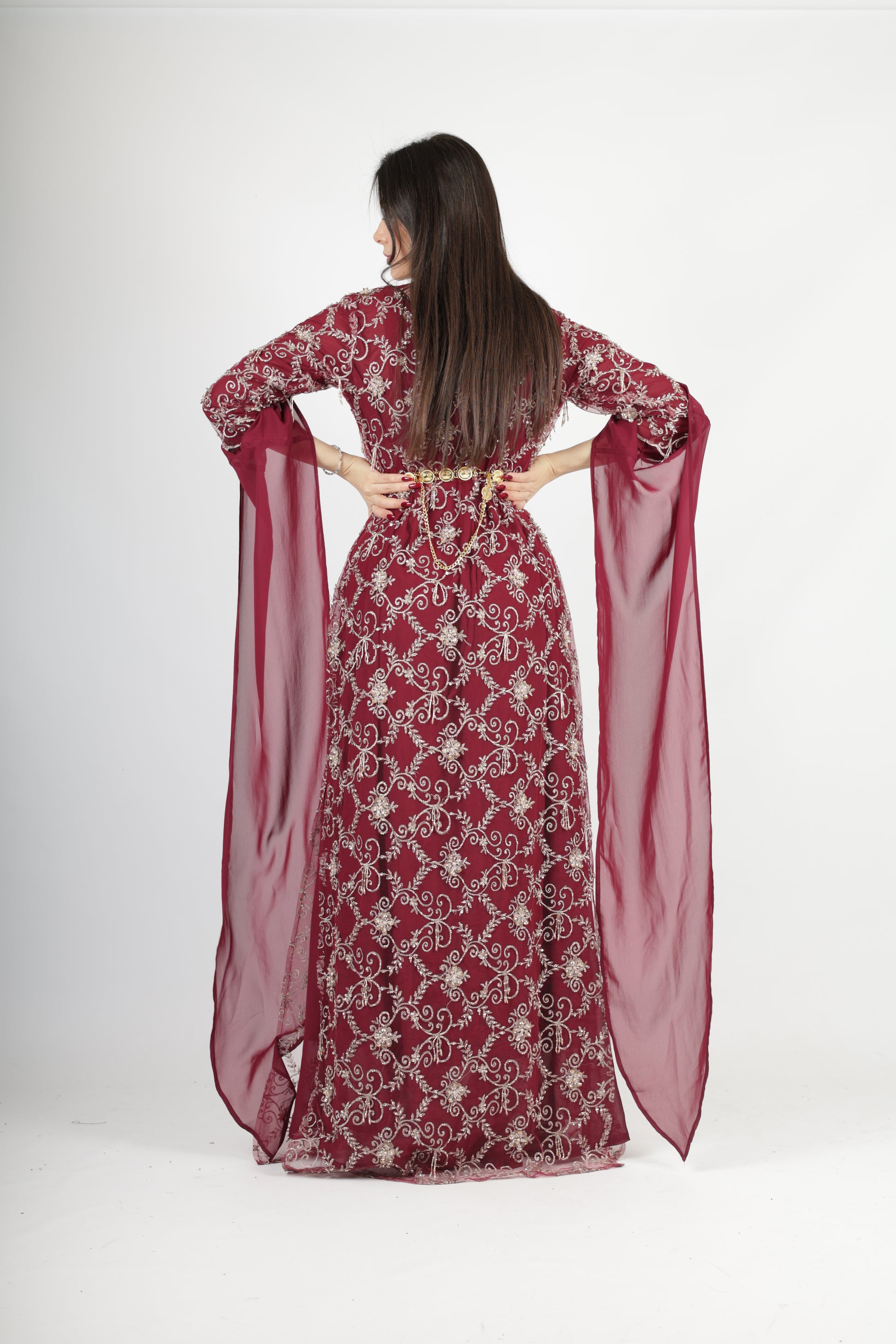Burgundy Kawa Dress with handmade crystal, bead, and pearl work