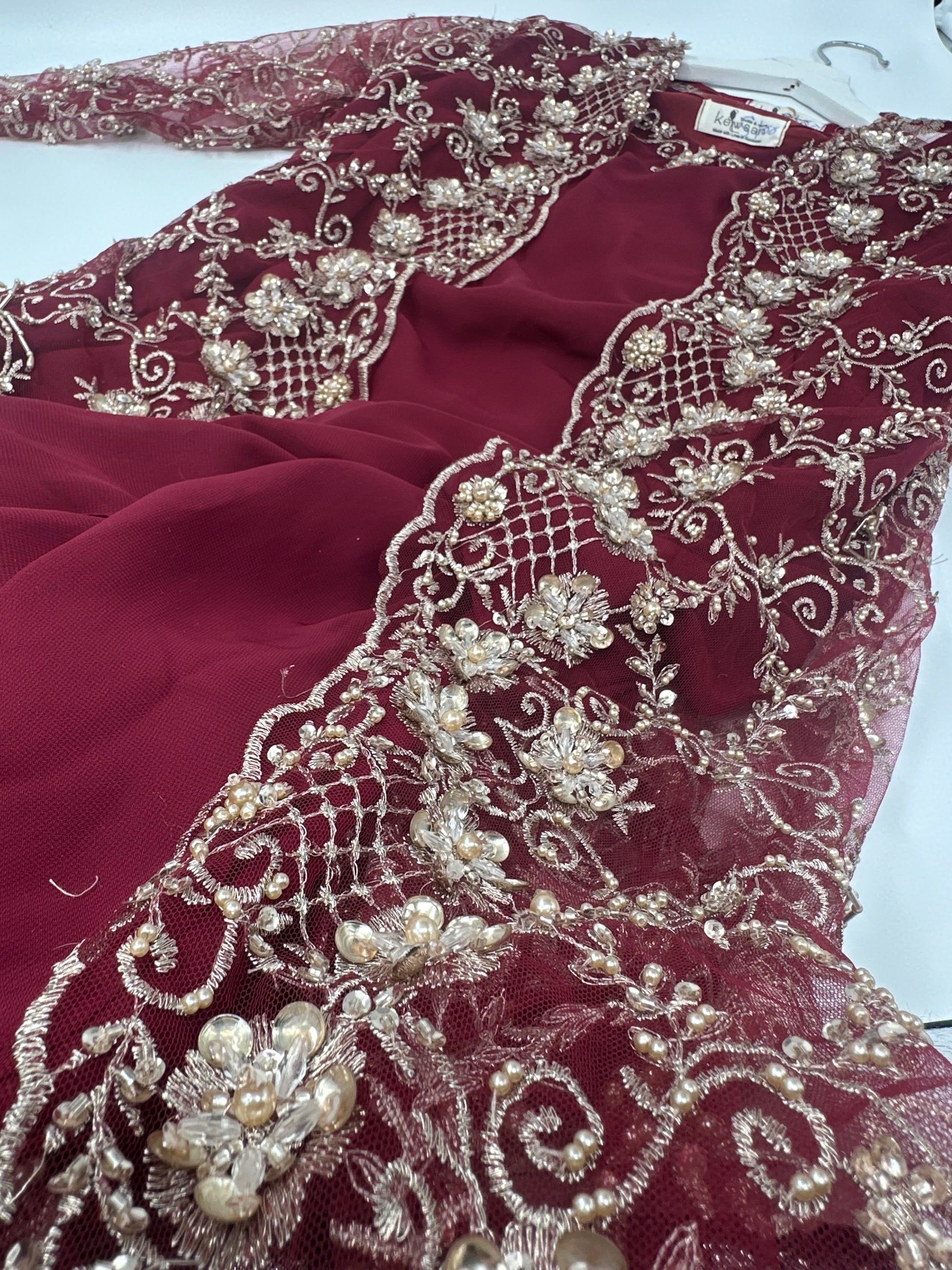 Burgundy Kawa Dress with handmade crystal, bead, and pearl work