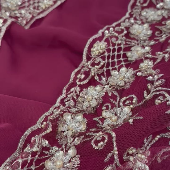 • Rich burgundy fabric with crystal, bead, and sequin embroidery