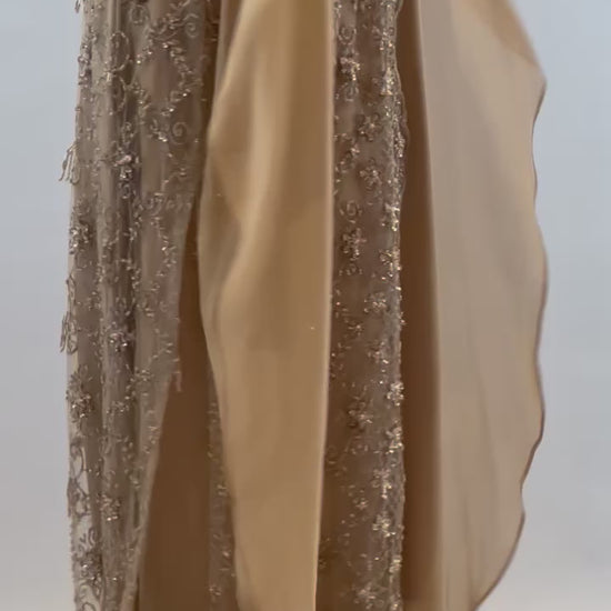 Golden Beige Kawa Dress with handmade crystal, bead, and pearl details