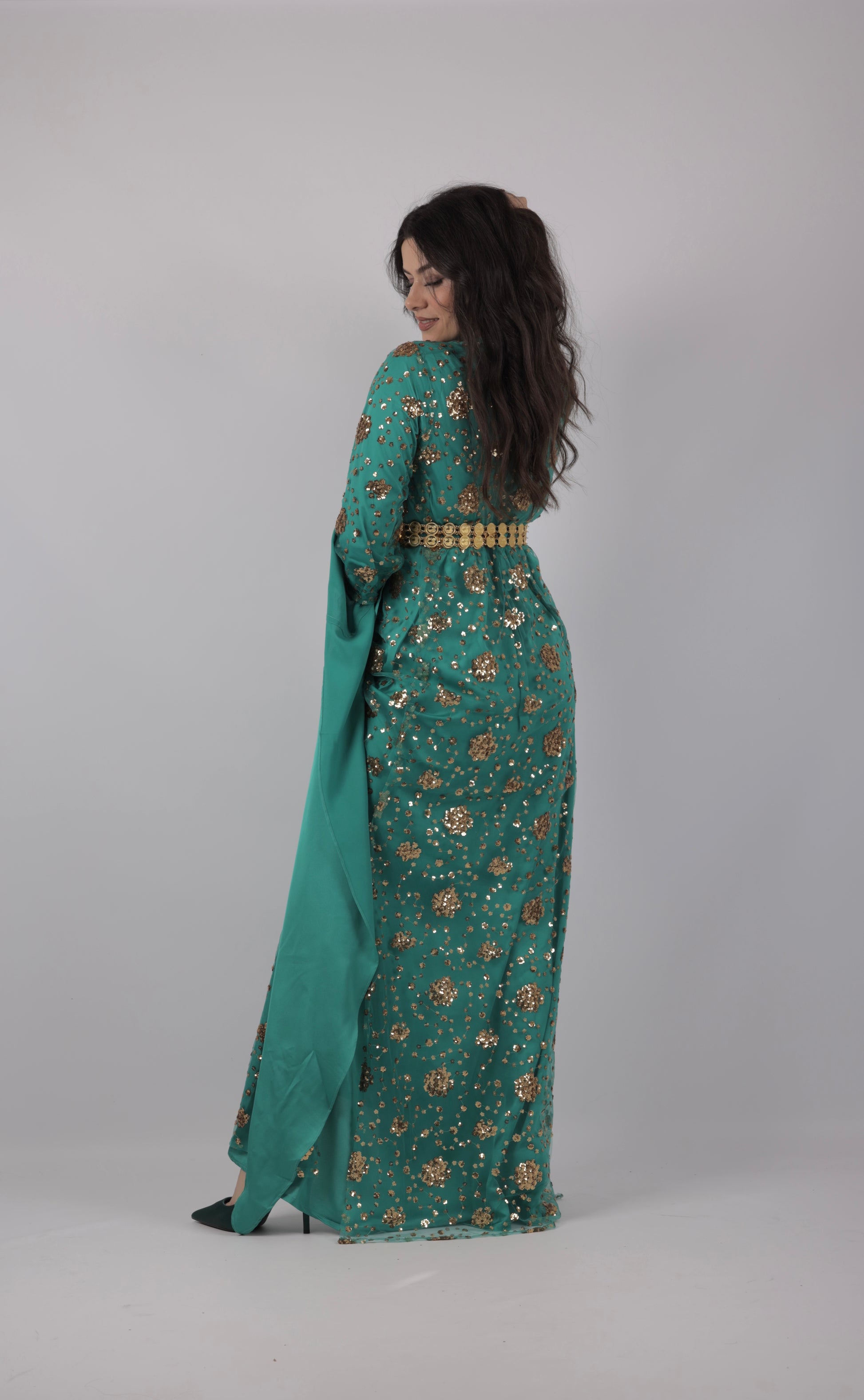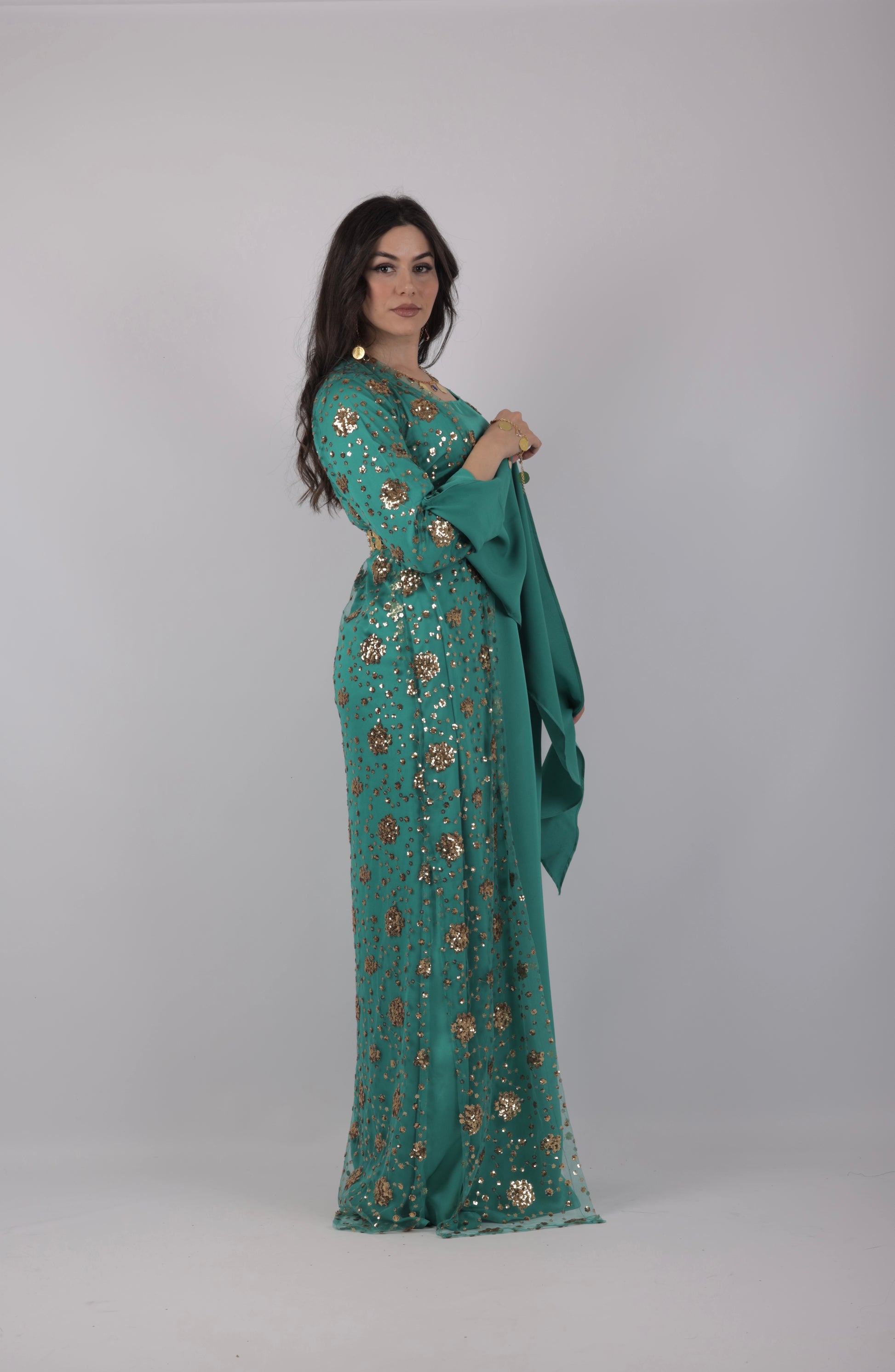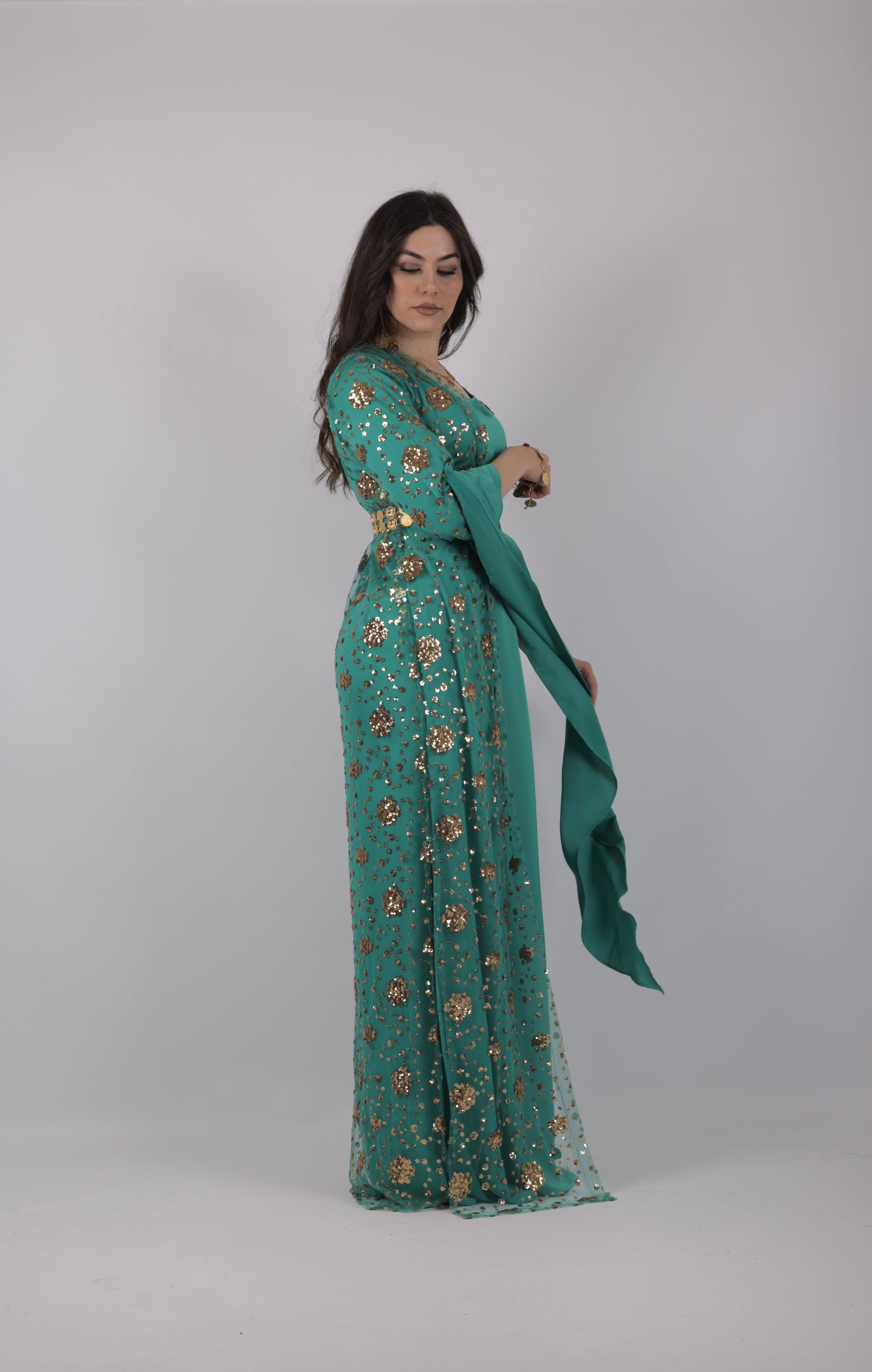 The Chro Collection in Green is inspired by spring, symbolizing growth, renewal, and Kurdish heritage. Designed exclusively by us, this collection features luxurious fabric embroidered with golden flowers, giving the dress a radiant and elegant shine.