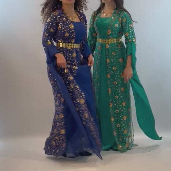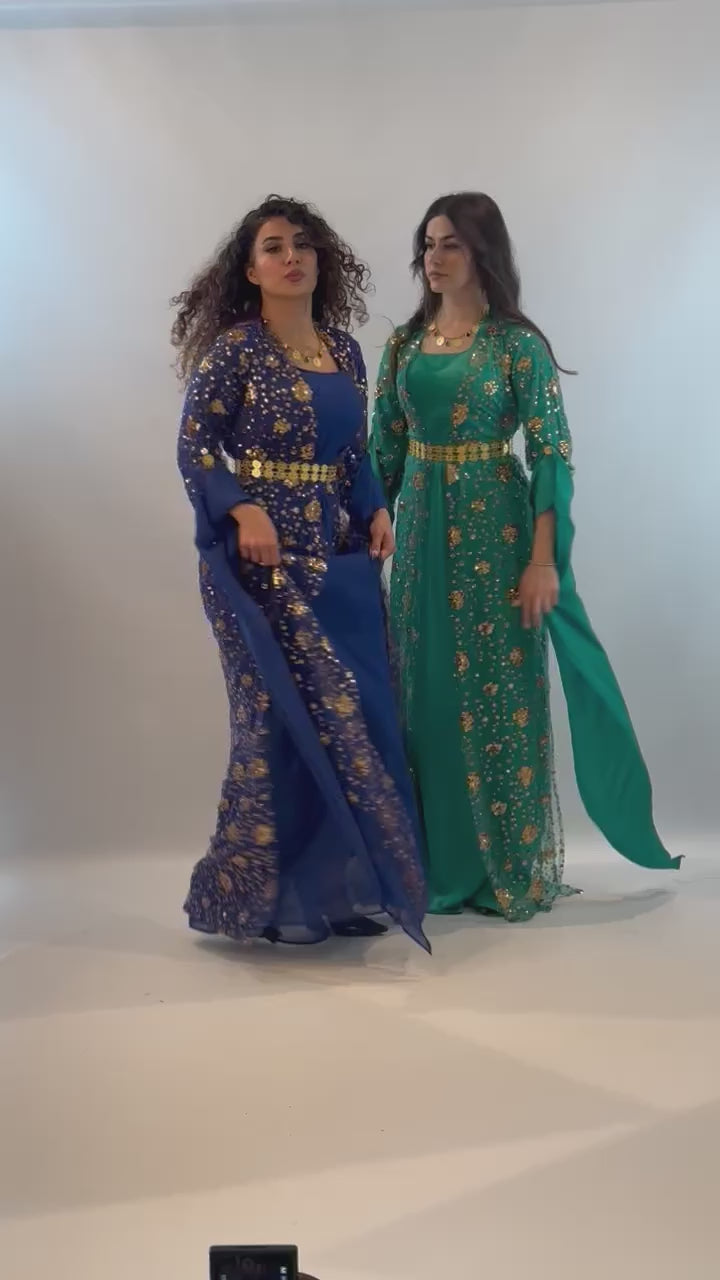 The Chro Collection in Green is a breathtaking Kurdish dress featuring golden flower embroidery. This 2-piece handmade set includes a traditional kawa and a flowing kras made with care by Kurdish tailors in Kurdistan. A unique design for weddings, Newroz, and cultural celebrations – created to honor Kurdish tradition with modern elegance.