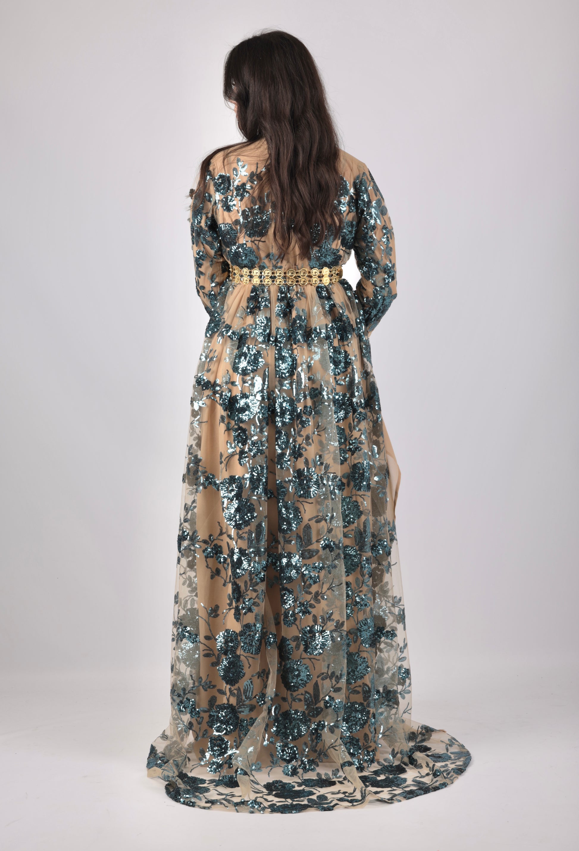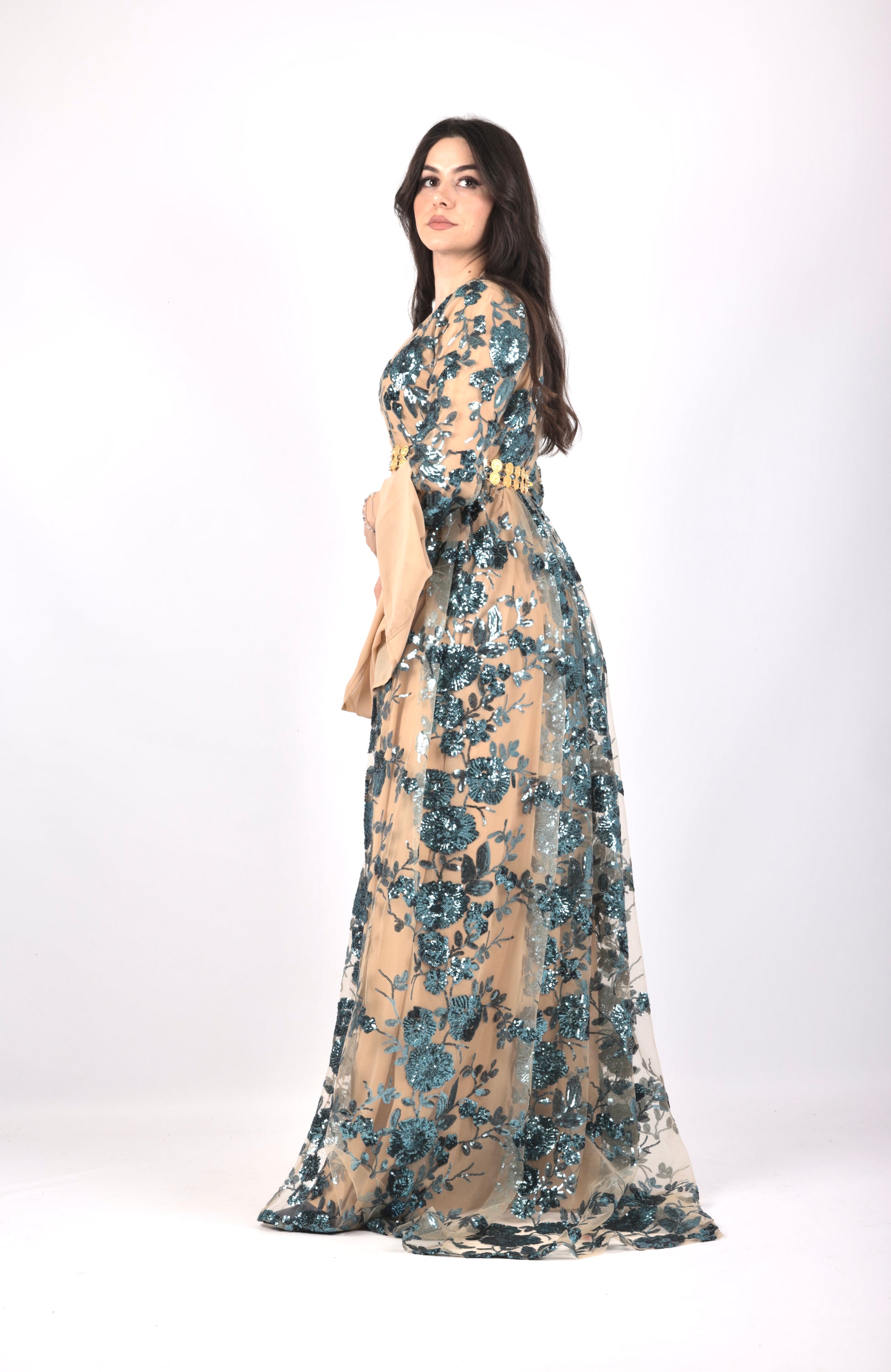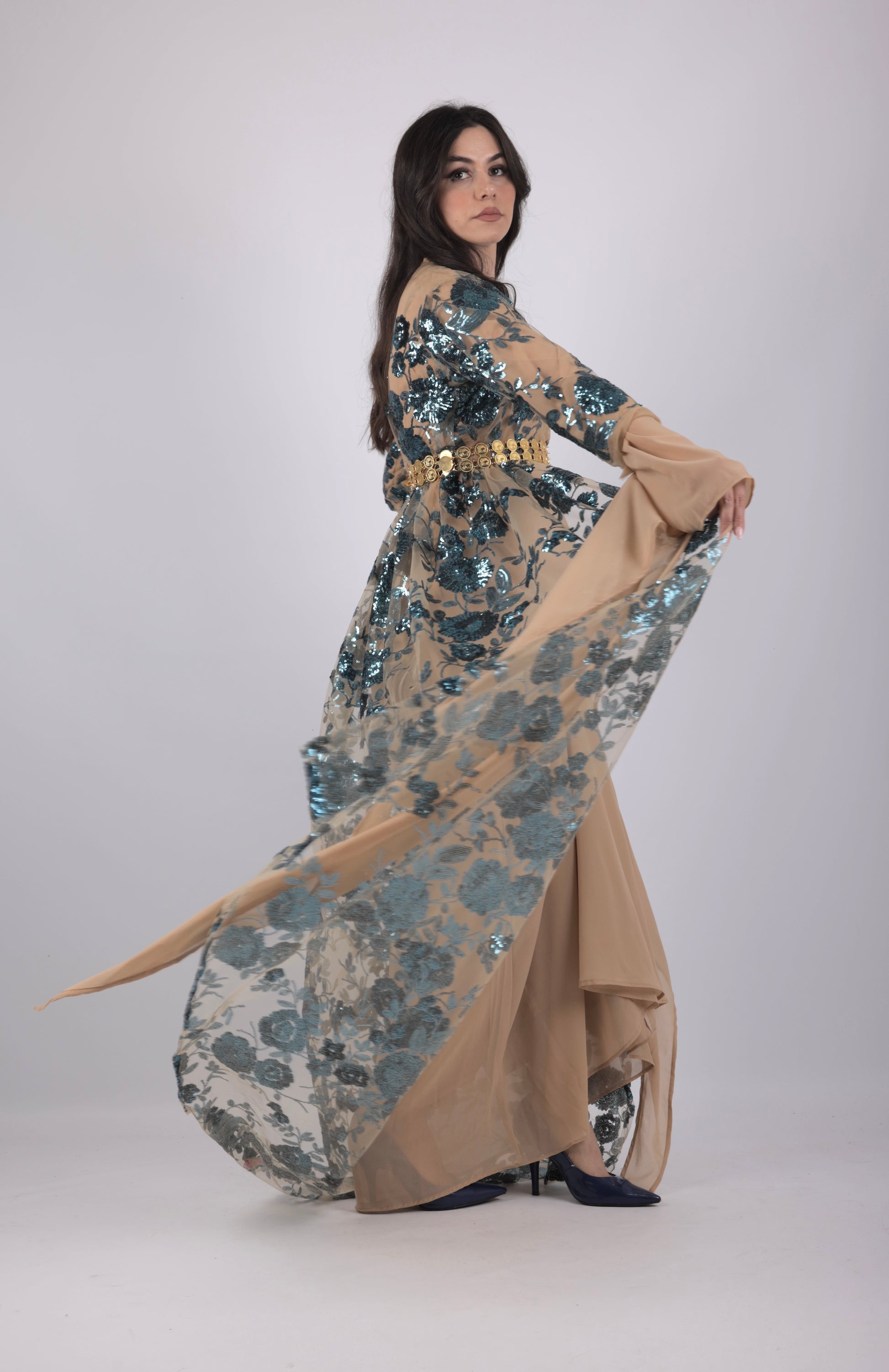 Step into elegance with the Dildar Kurdish Dress in stunning turquoise sequins on soft nude mesh – a truly eye-catching blend of Kurdish heritage and modern fashion. Expertly handcrafted by skilled Kurdish women tailors from Kewsan Textile Company, this dress reflects both tradition and sophistication.