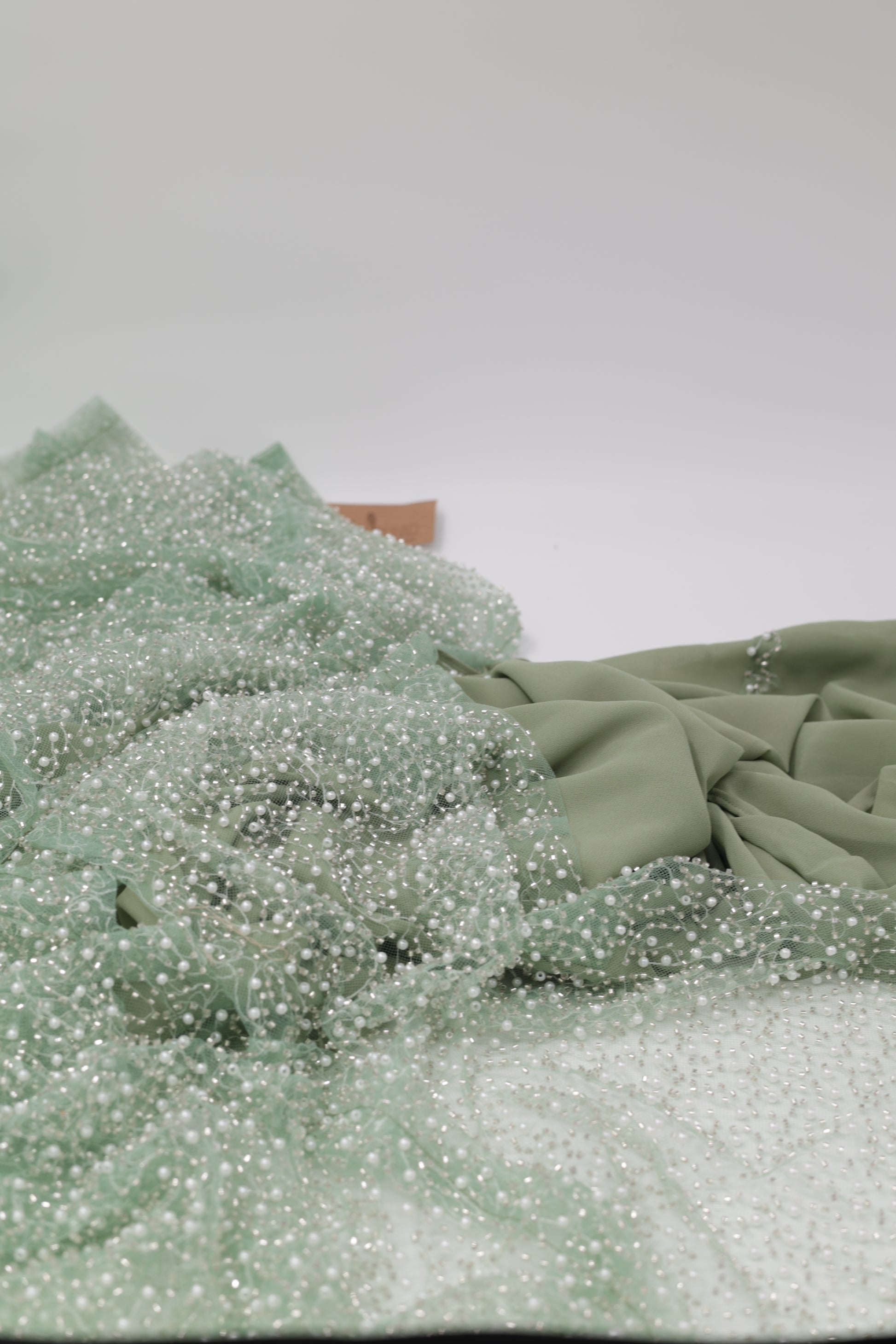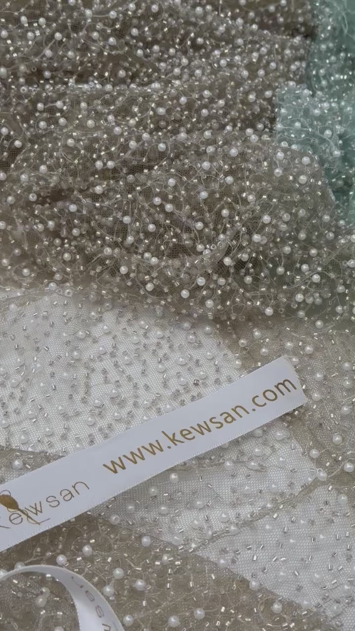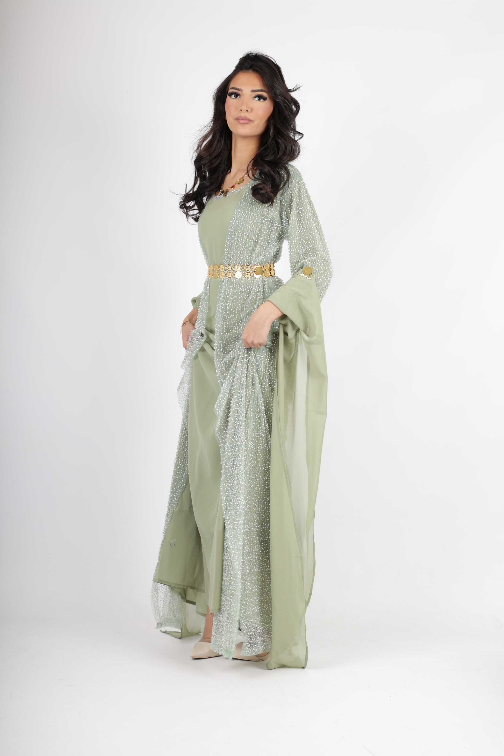 The pearl embroidery is carefully applied by hand, creating a soft shine and luxurious texture without overpowering the design. The hand-designed neckline adds elegance while honoring traditional Kurdish fashion.