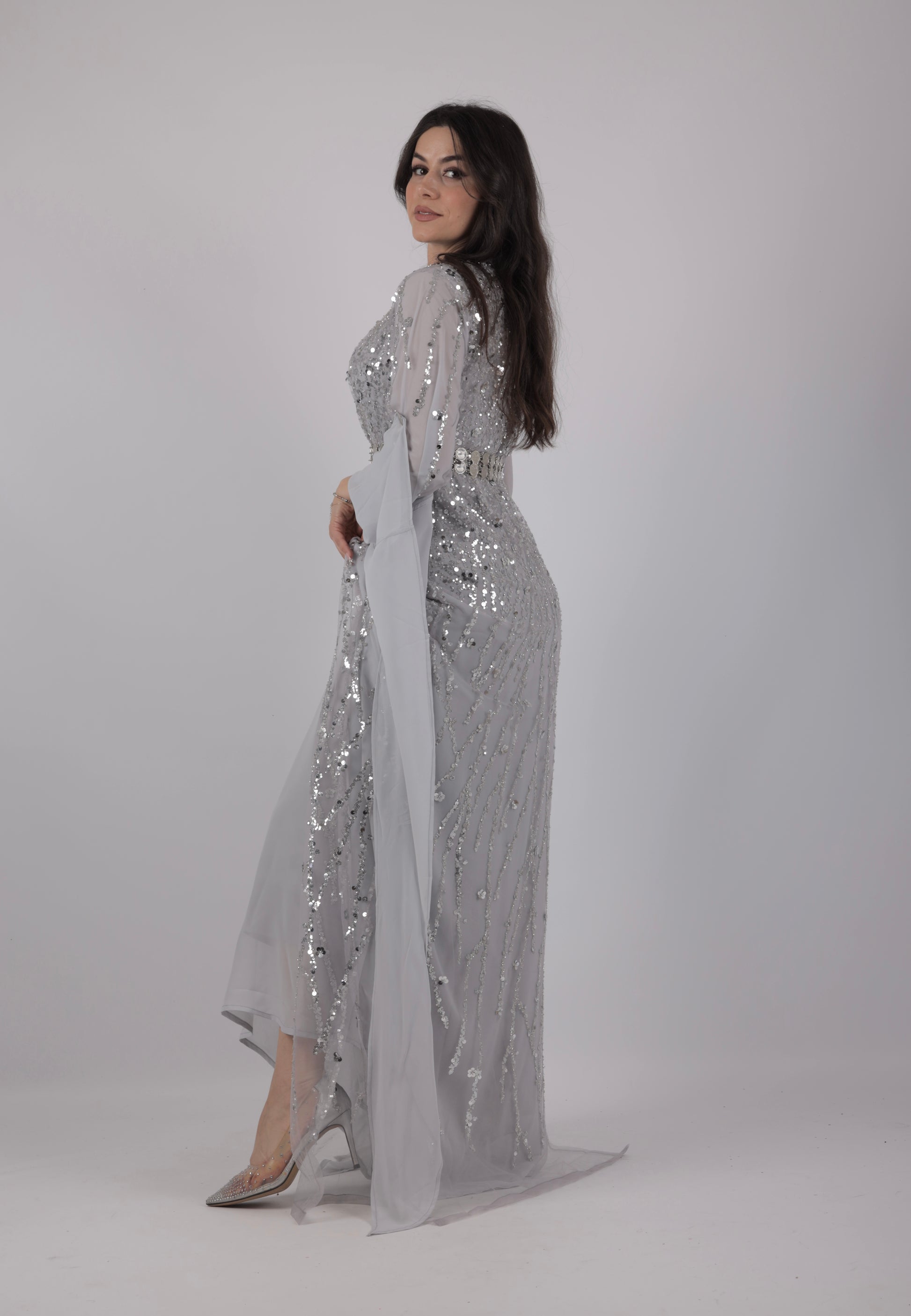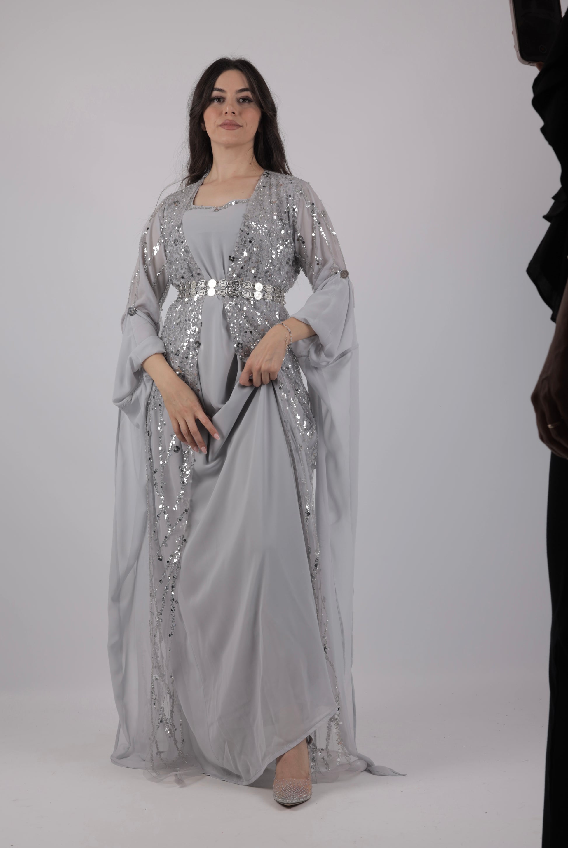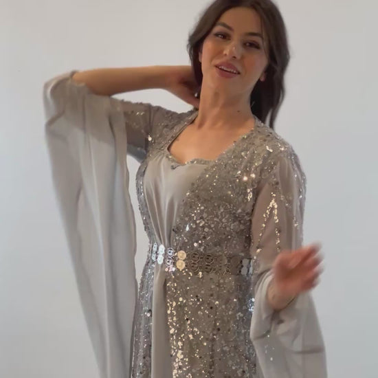 Newroz Kollektion – Kleid in Hellgrau mit Silberstickerei (3-teiliges Set)