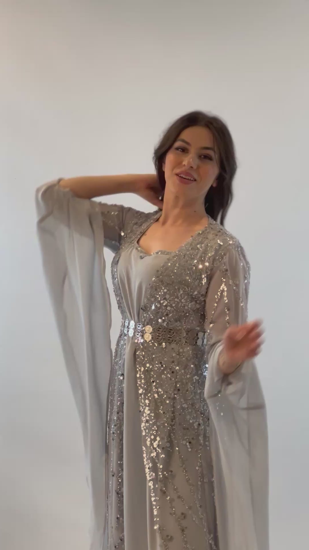 Feiere Newroz mit Eleganz. Unser hellgraues Kleid aus der Newroz Kollektion mit Silberstickerei, Perlen und Pailletten ist ein echtes Highlight. Das 3-teilige Set umfasst eine kunstvoll bestickte Kawa, ein fließendes Chiffon-Cross und passende Unterkleidung. Dank verstellbarer Details passt sich das Kleid perfekt deiner Figur an.