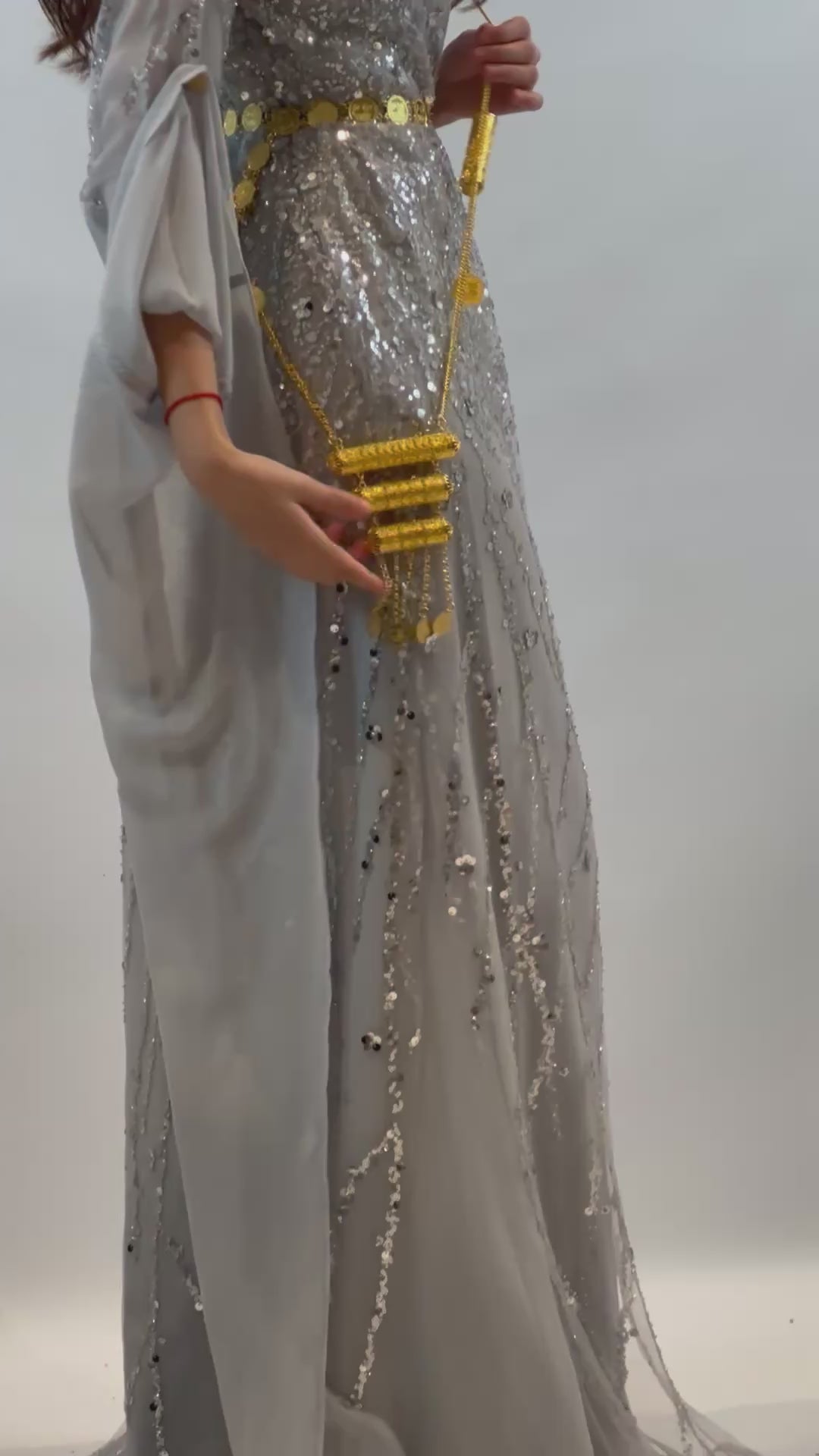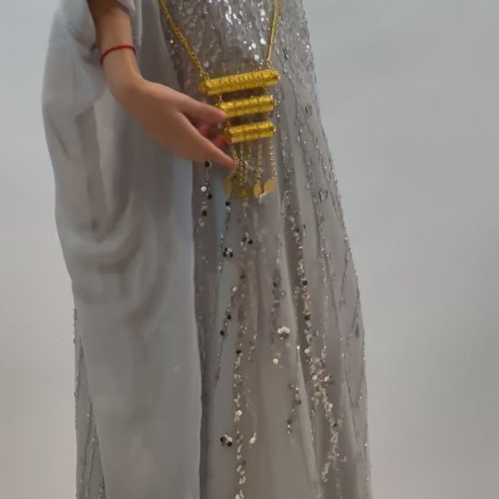 Celebrate Newroz with elegance. Our light grey dress from the Newroz Collection features silver embroidery, beads, and sequins. This 3-piece set includes a beautifully embroidered kawa, a flowing chiffon cross, and matching underwear. Adjustable details ensure the perfect fit for every figure.