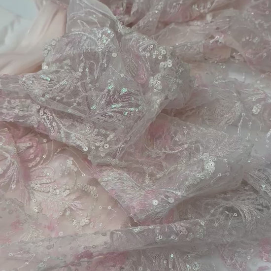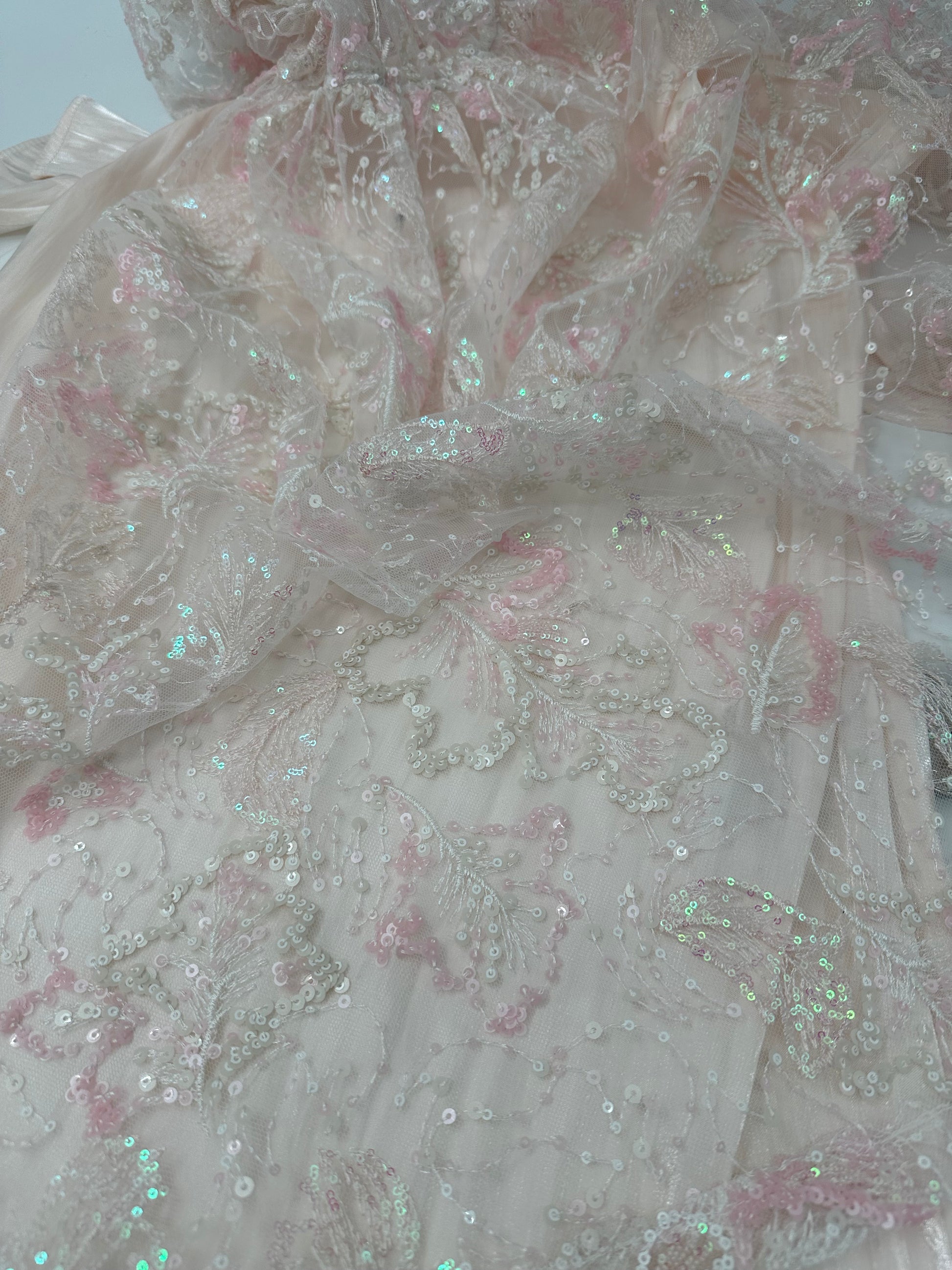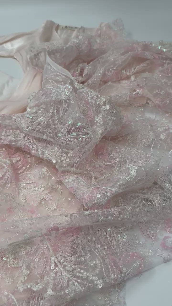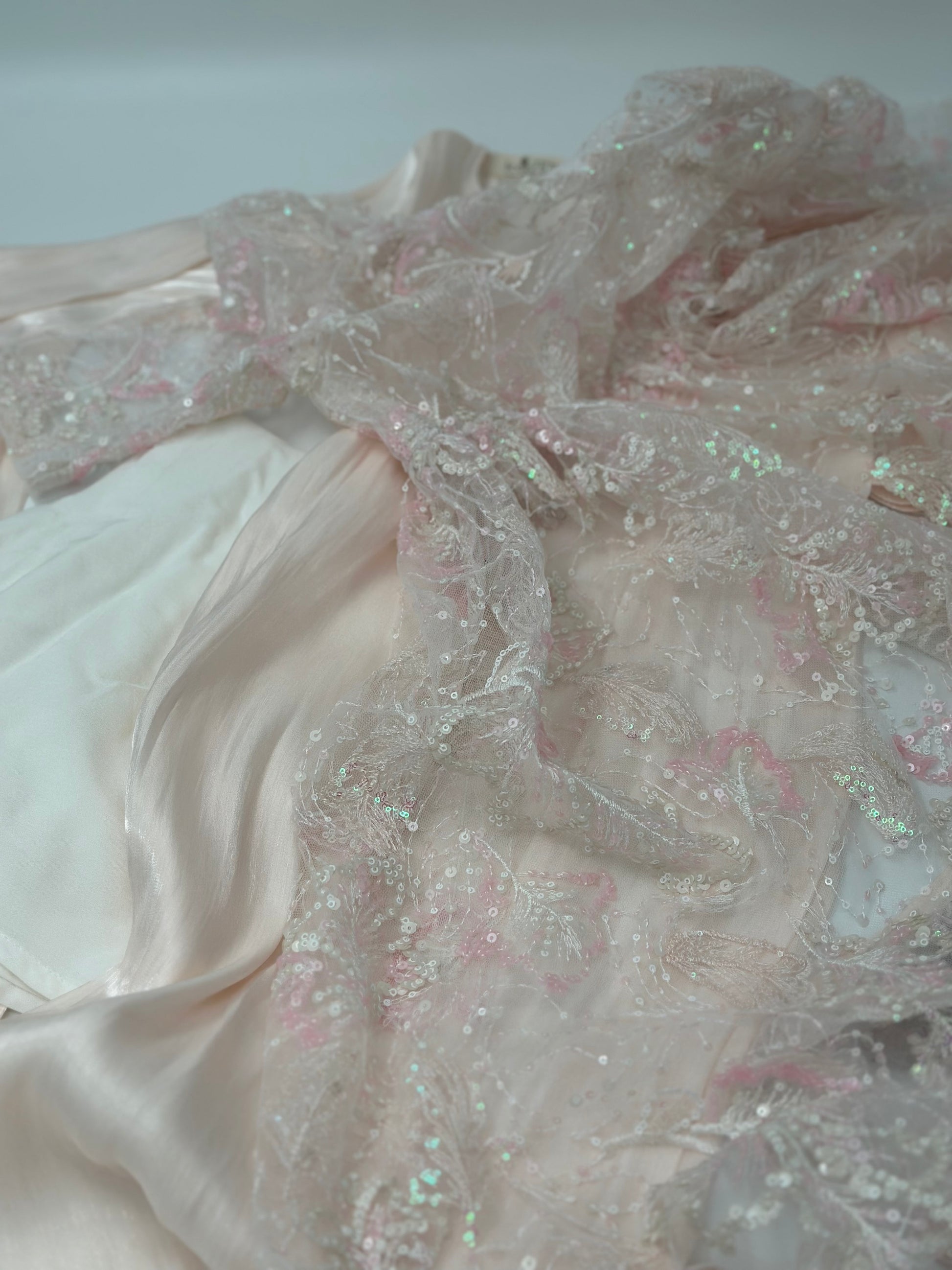 Kawa (outer layer) – designed in the Badini model, crafted with white and pink sequins embroidery.