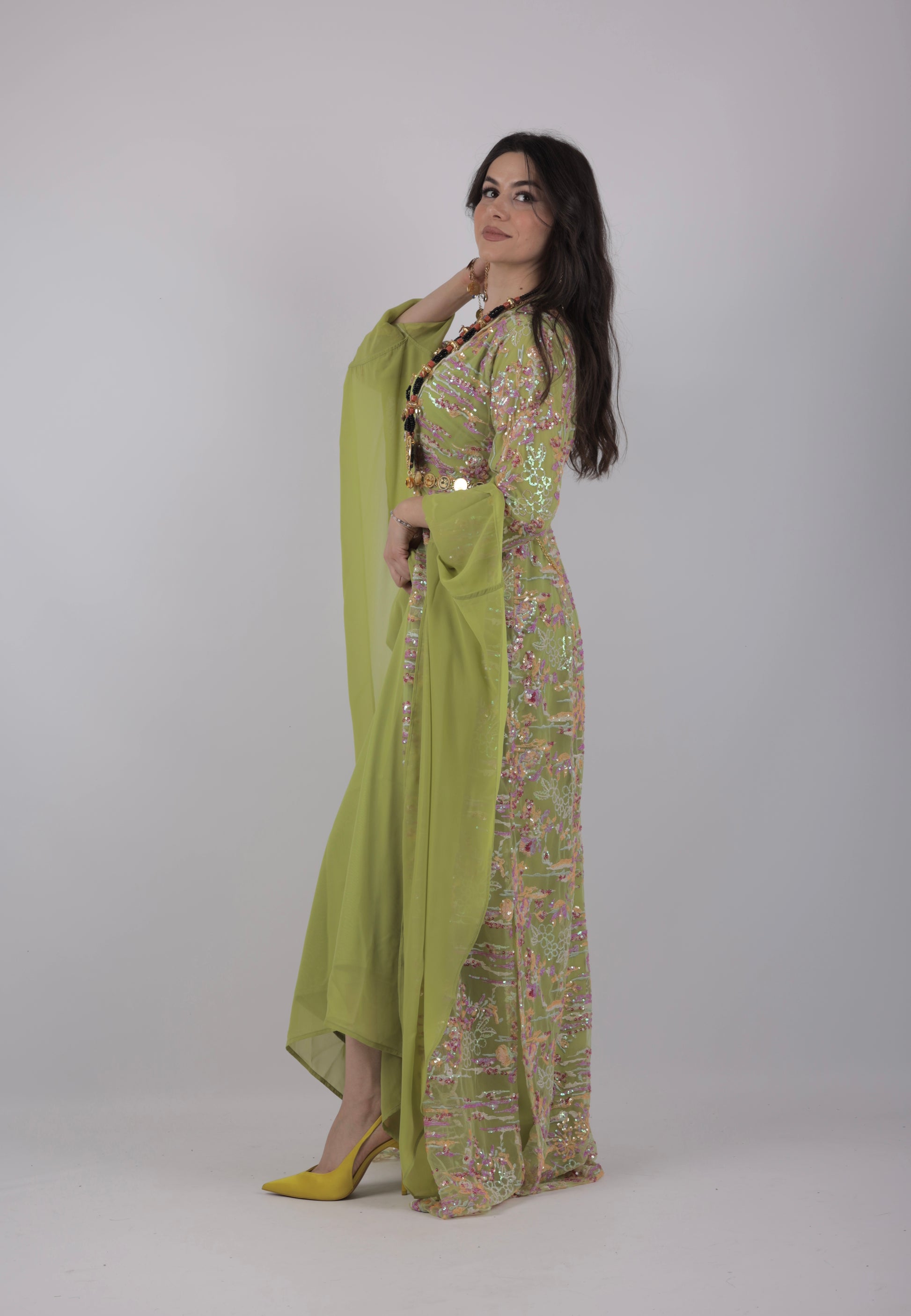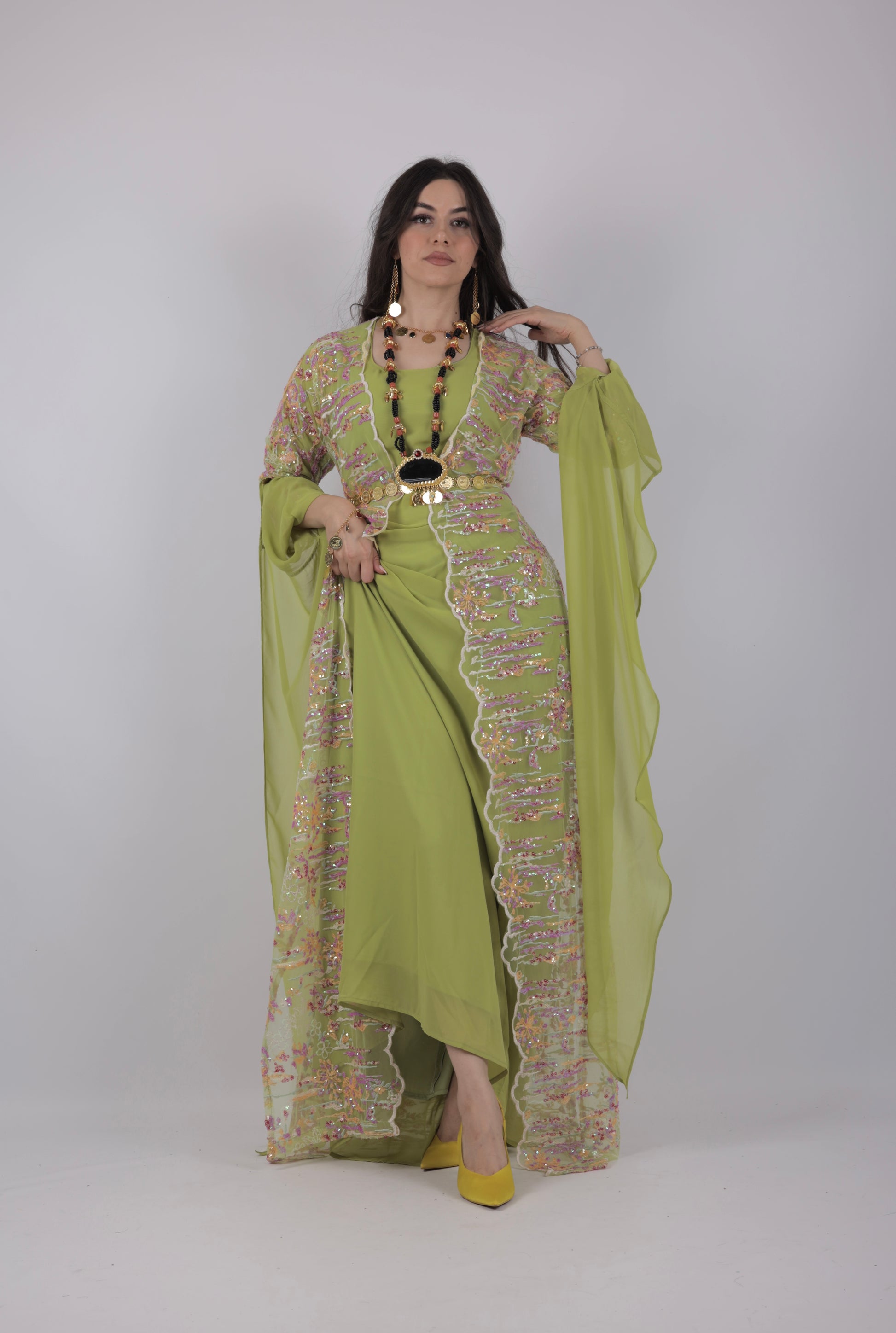 Celebrate Kurdish culture in style with our Ru Xosh Dress from the Newroz Collection. This beautiful green Kurdish dress symbolizes renewal, joy, and elegance. Decorated with hot pink, magenta, and multicolor embroidery, shimmering beads, and sequins, this 3-piece set includes:
