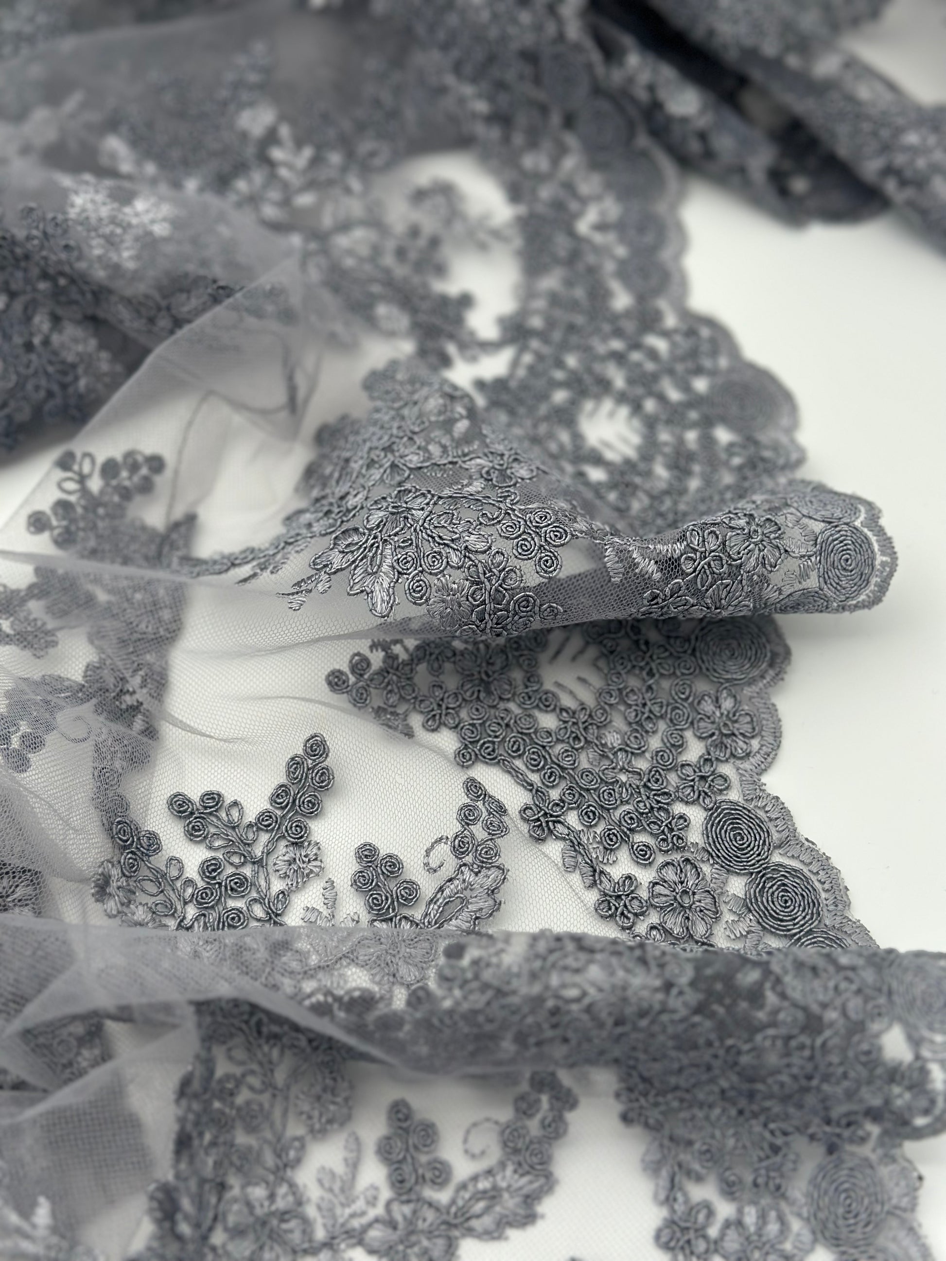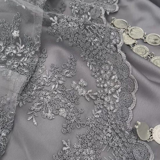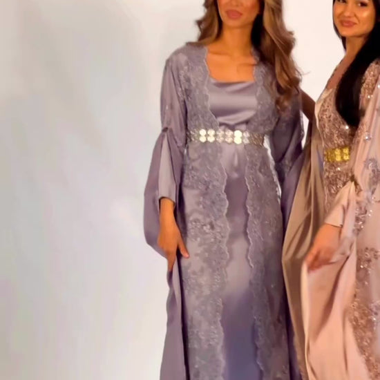 Kawa (outer dress): Made from soft, flowing fabric in a calm lavender-grey shade. It has a light shimmer and a soft texture that gives the dress a dreamy and modern feel.