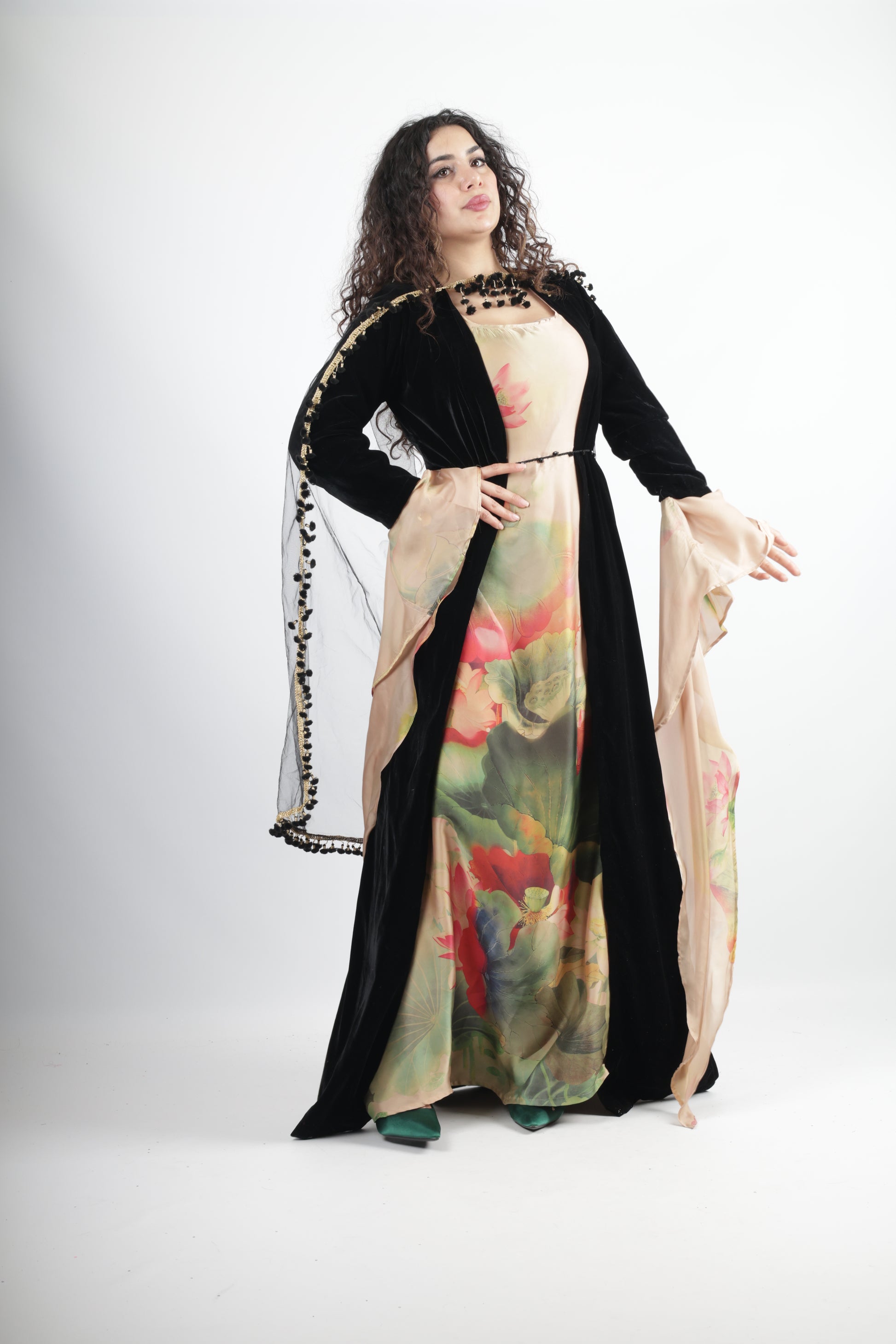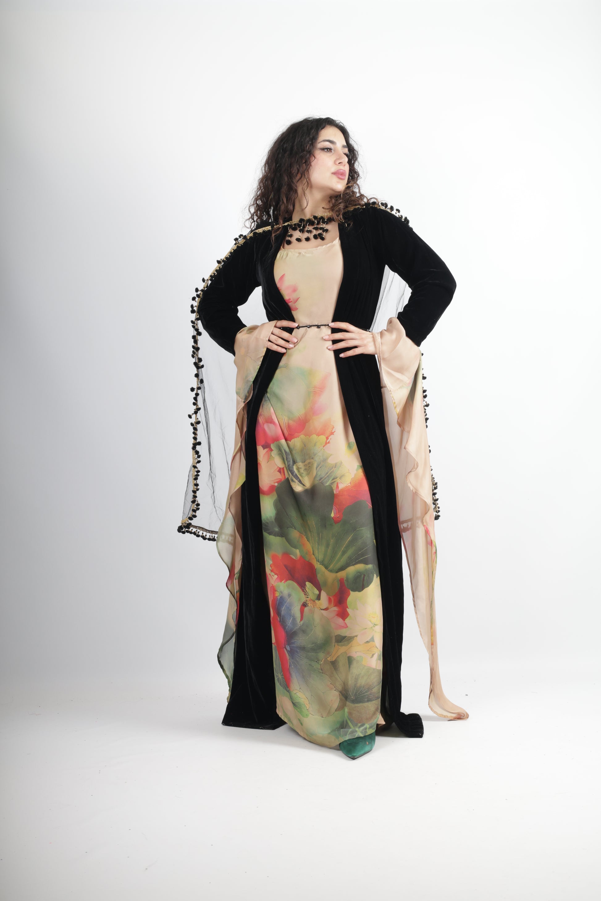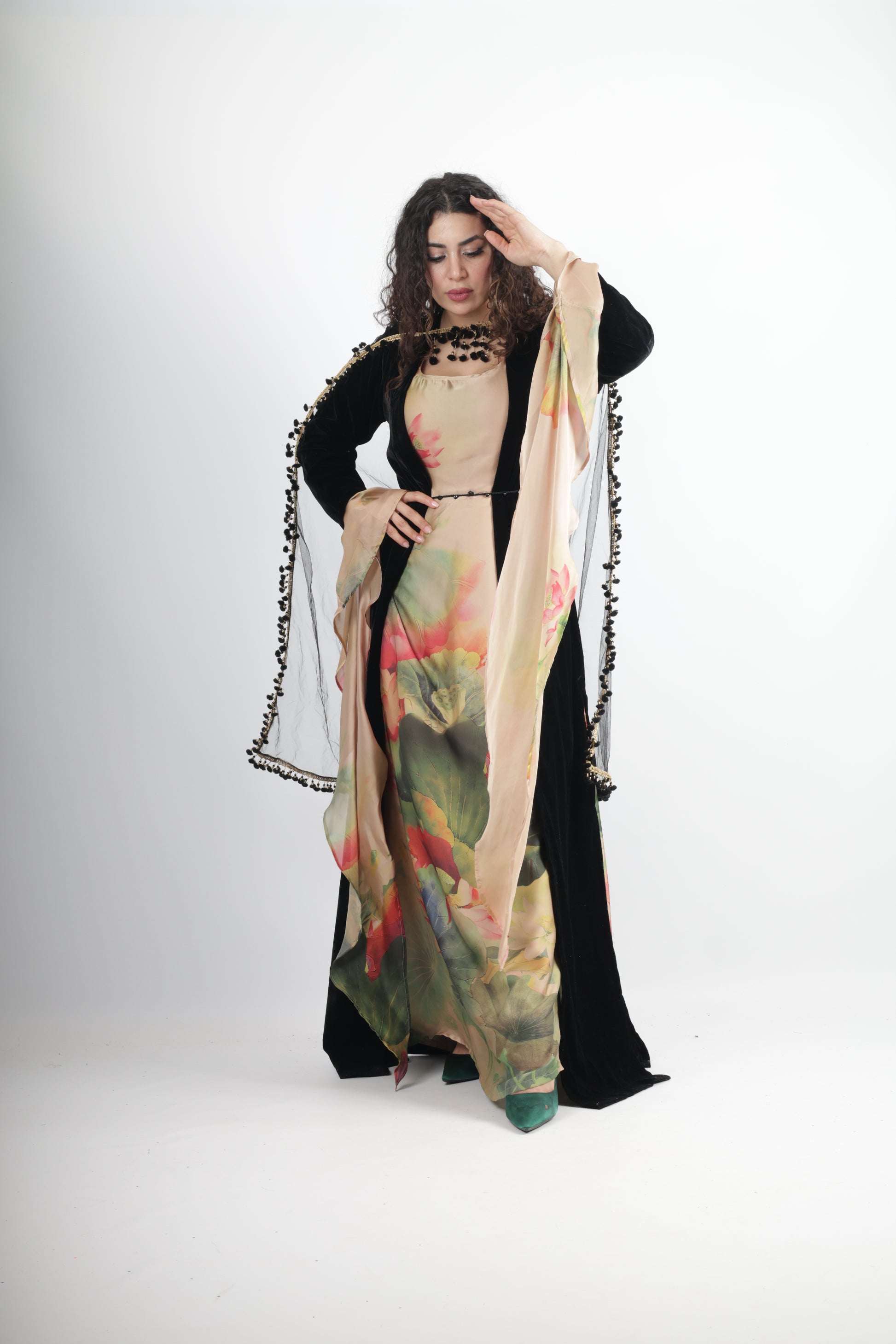 The Kawa cut with velvet adds a modern, regal twist to a traditional silhouette, making this a timeless piece that connects past and present.