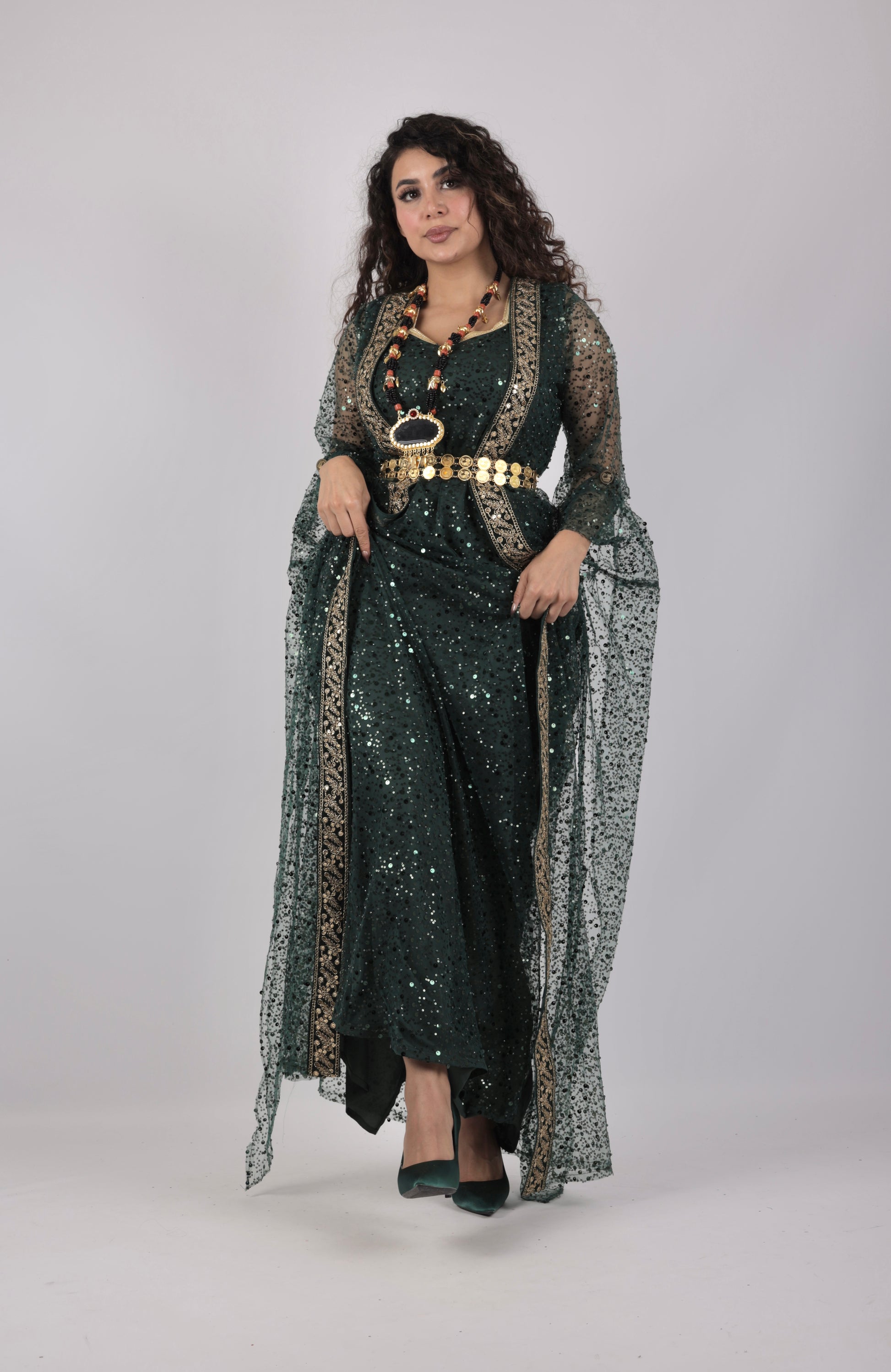Highlights the beauty of the dress with layered Kurdish styling.