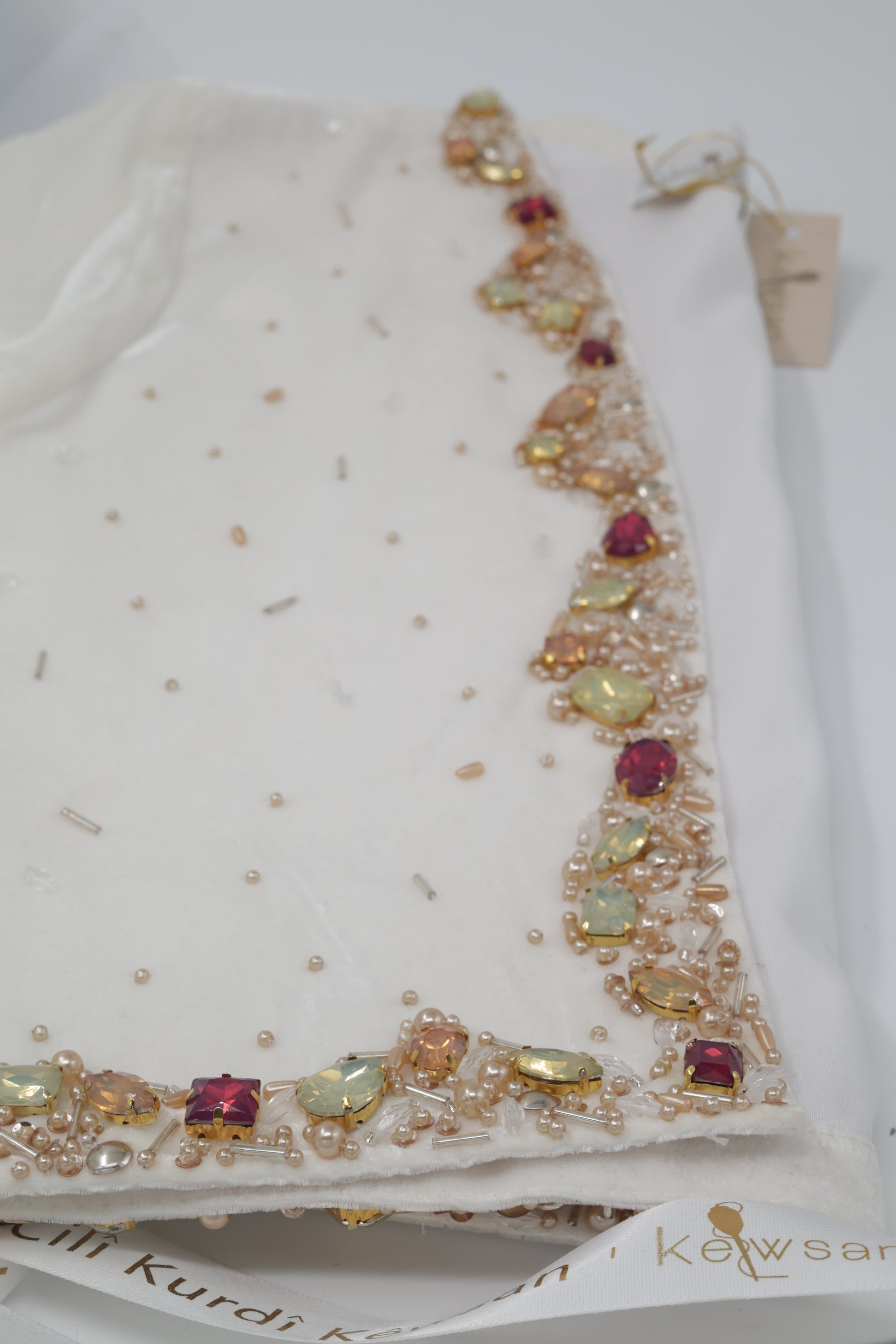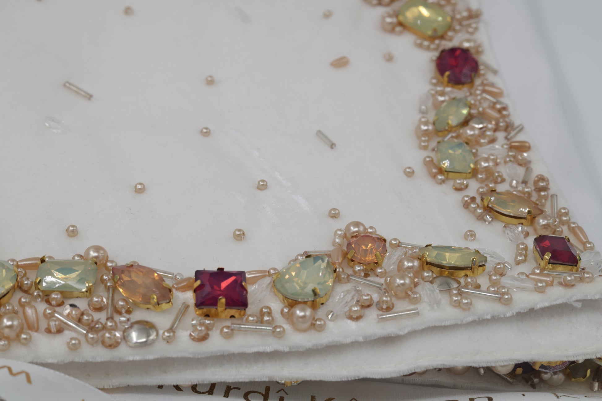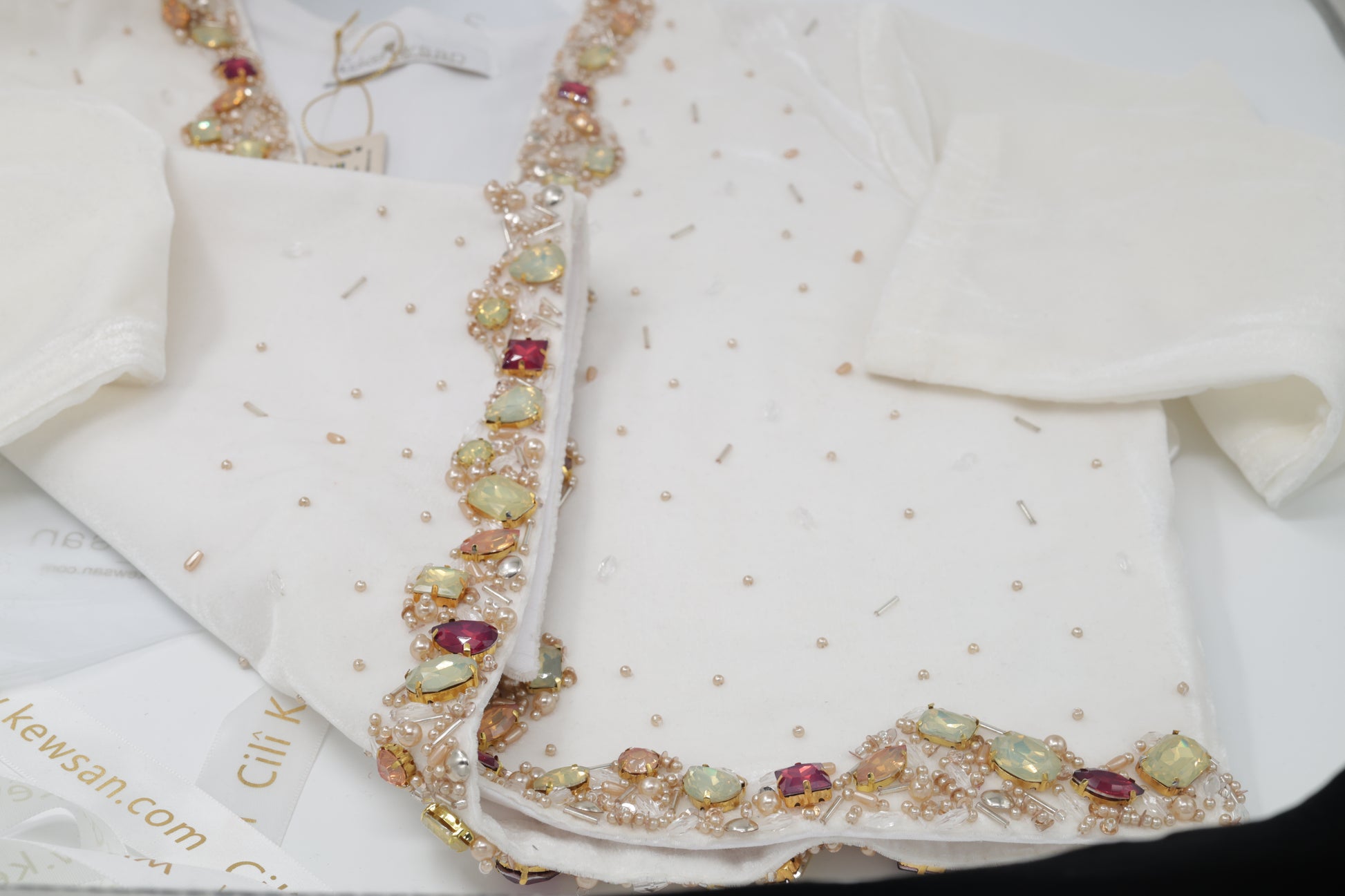 Discover the perfect blend of tradition and elegance with this Salte vest. Handmade by skilled Kurdish women artisans, this vest features high-quality tailoring and sparkling Swarovski crystals on black velvet. The rich color palette—black, dark green, and complementary tones—gives it a sophisticated look that’s perfect for special occasions or elevating everyday outfits.