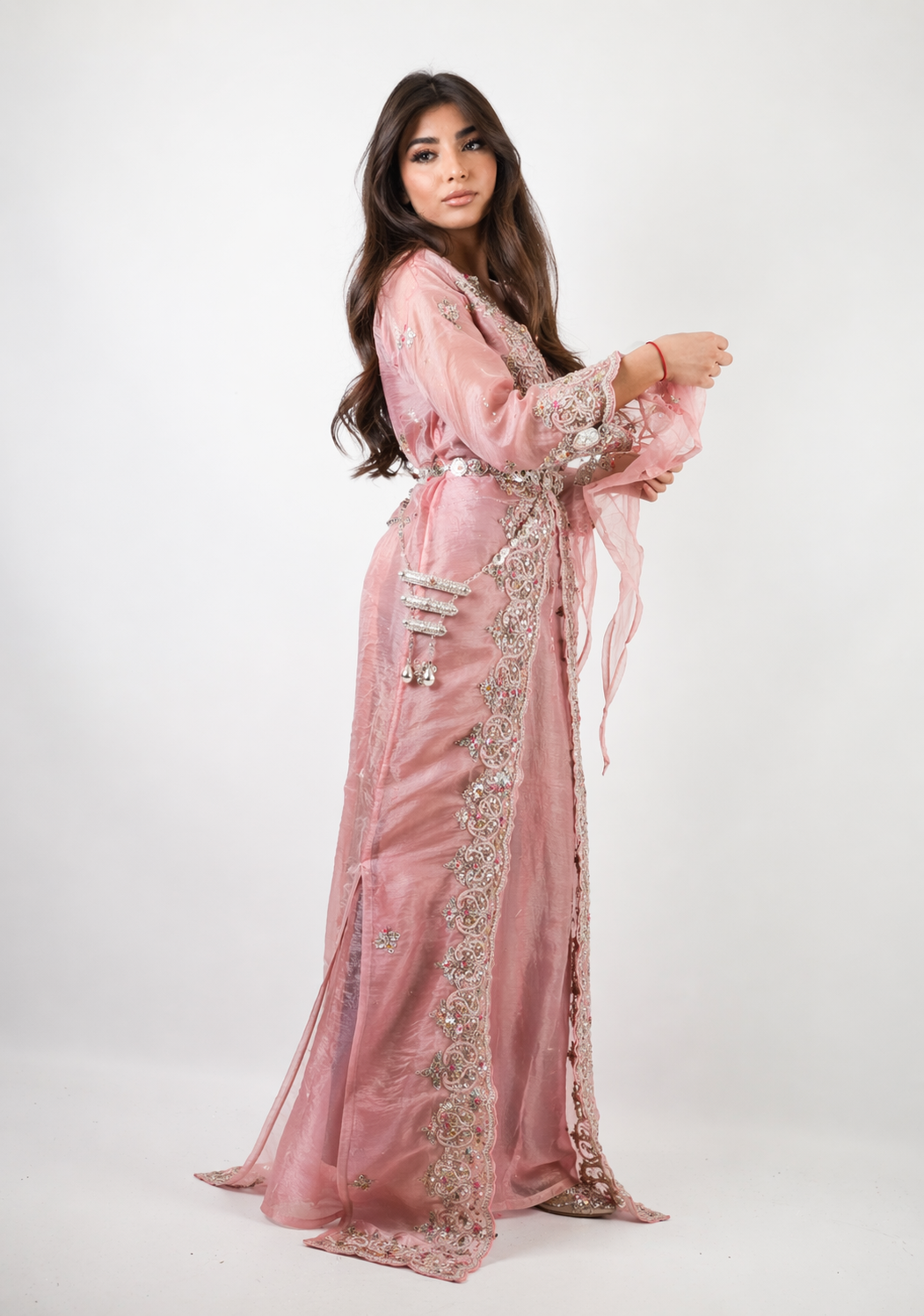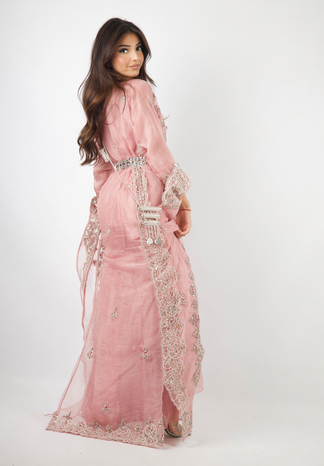 The soft pink -not baby rose not dust pink ( something between these) color gives the dress a warm, earthy, and elegant appearance, making it perfect for both daytime and evening celebrations.